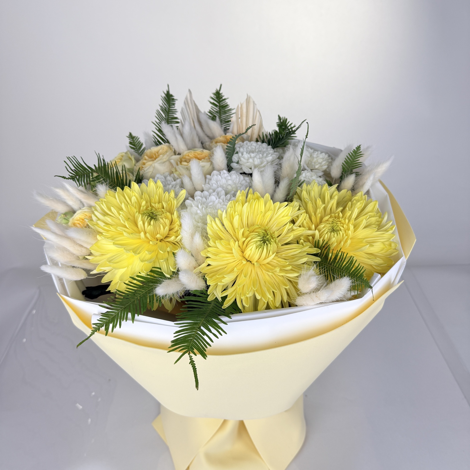 Состав: роза 5, хризантема 3, хризантема кустовая 2, роза кустовая 1 и прочее. под заказ