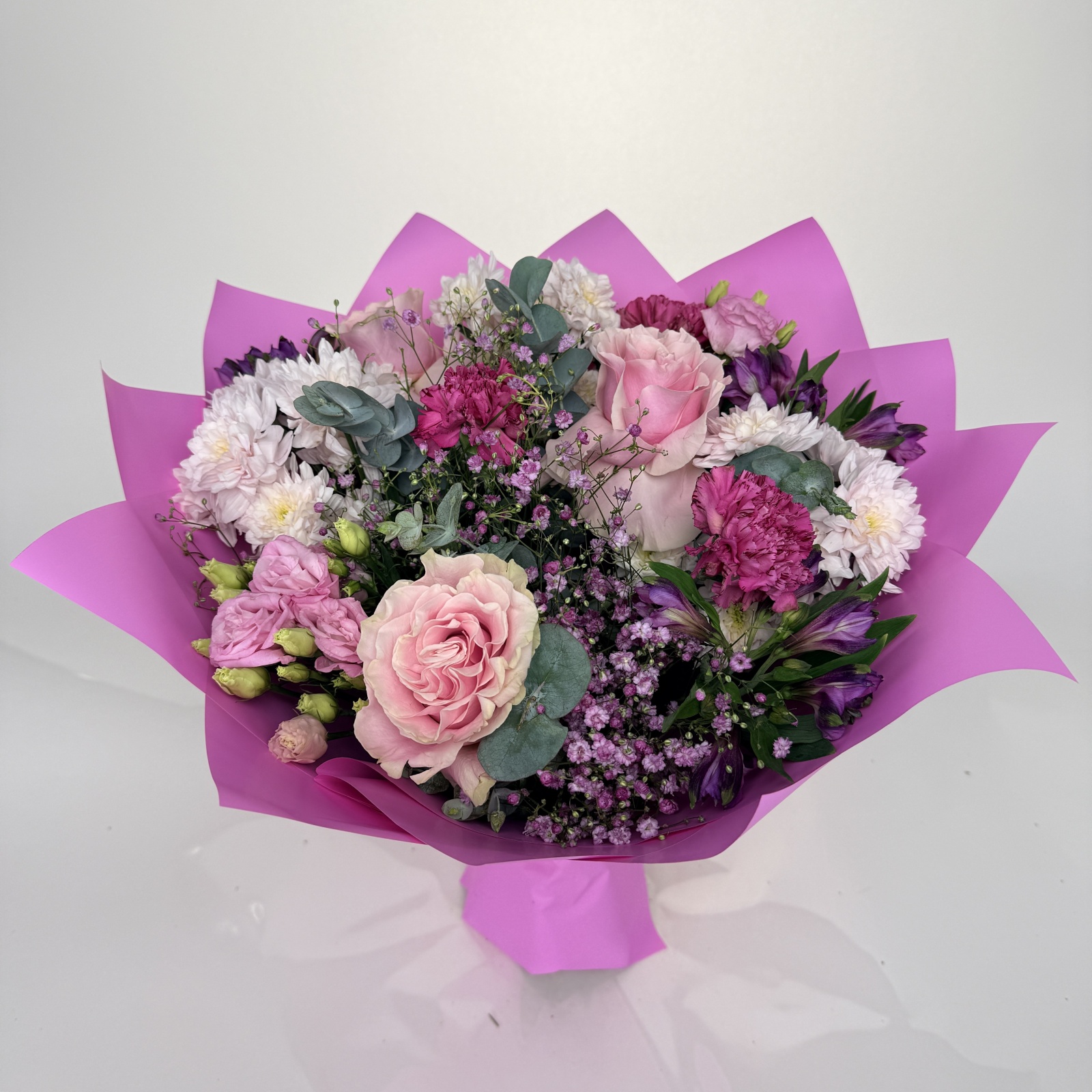 Состав: альстромерия 3, гвоздика 3, хризантема кустовая 3, лизиантус 3, роза 2, эвкалипт 2, анемон 1 и прочее. под заказ