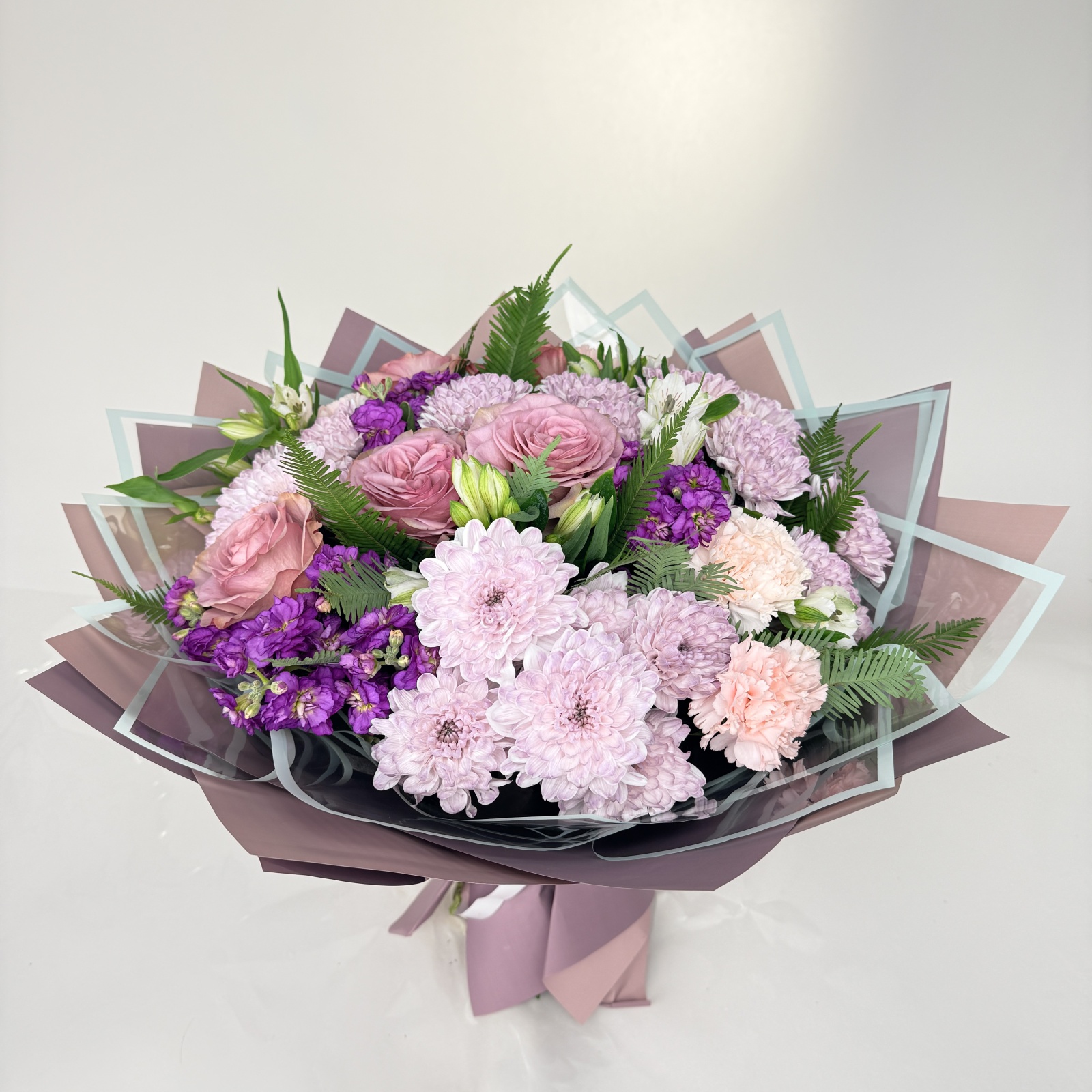 Состав: гвоздика 5, хризантема кустовая 5, роза 4, альстромерия 4, маттиола 3 и прочее. под заказ