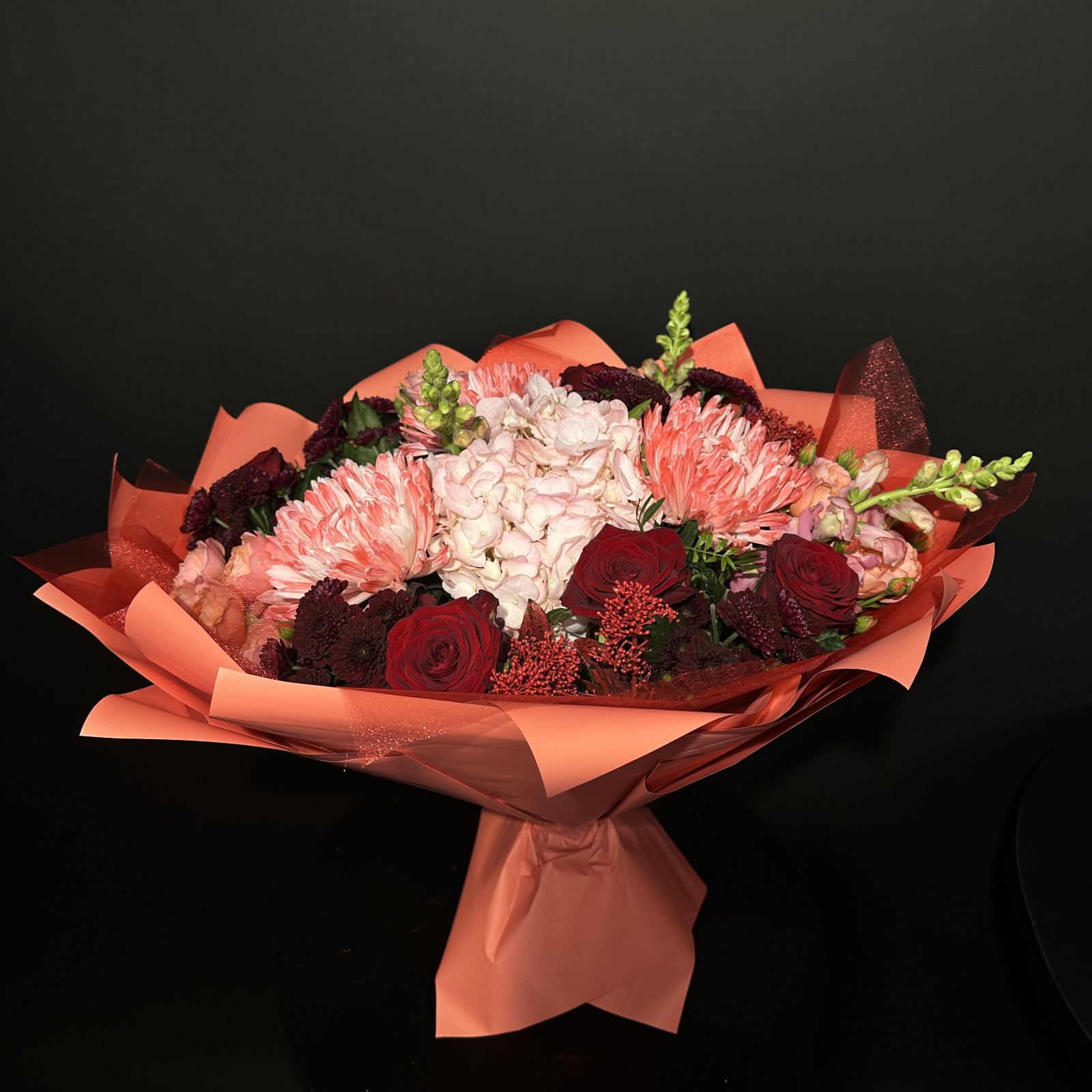 Состав: хризантема 8, роза 5, роза кустовая 3, антирринум 3, фисташка 1, гортензия 1 и прочее.