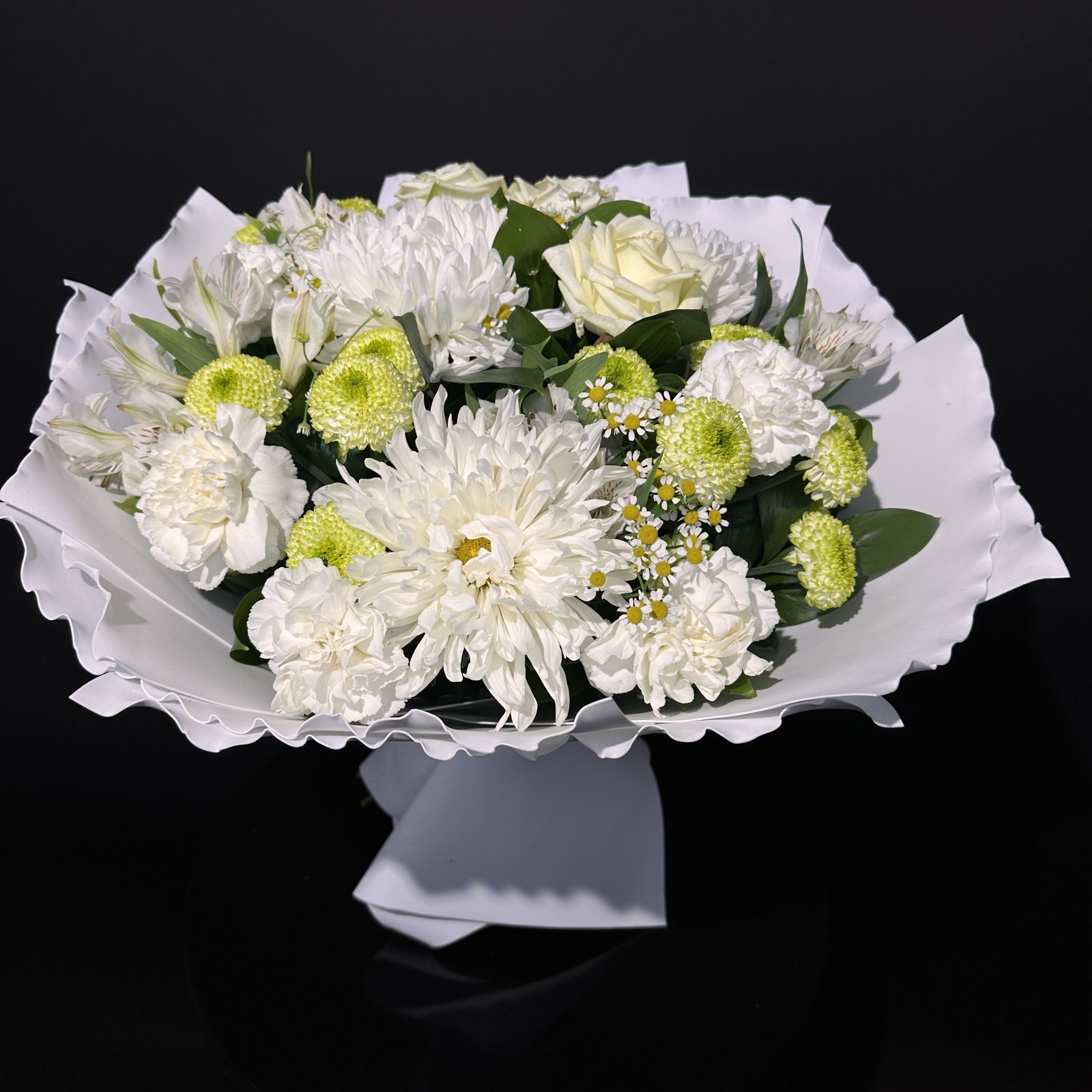 Состав: гвоздика 7, альстромерия 4, хризантема кустовая 3, хризантема 3, роза 3, рускус 1 и прочее.