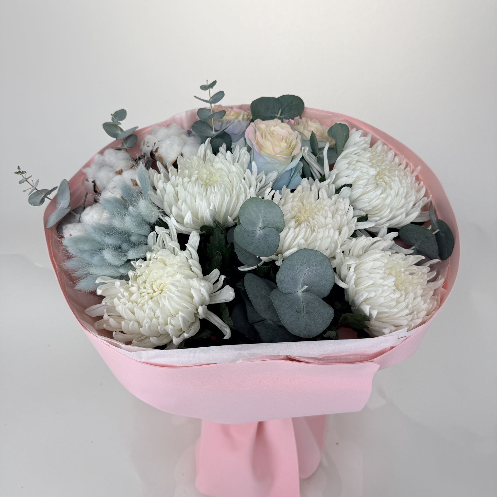 Состав: роза 6, хризантема 5, эвкалипт 2 и прочее. под заказ