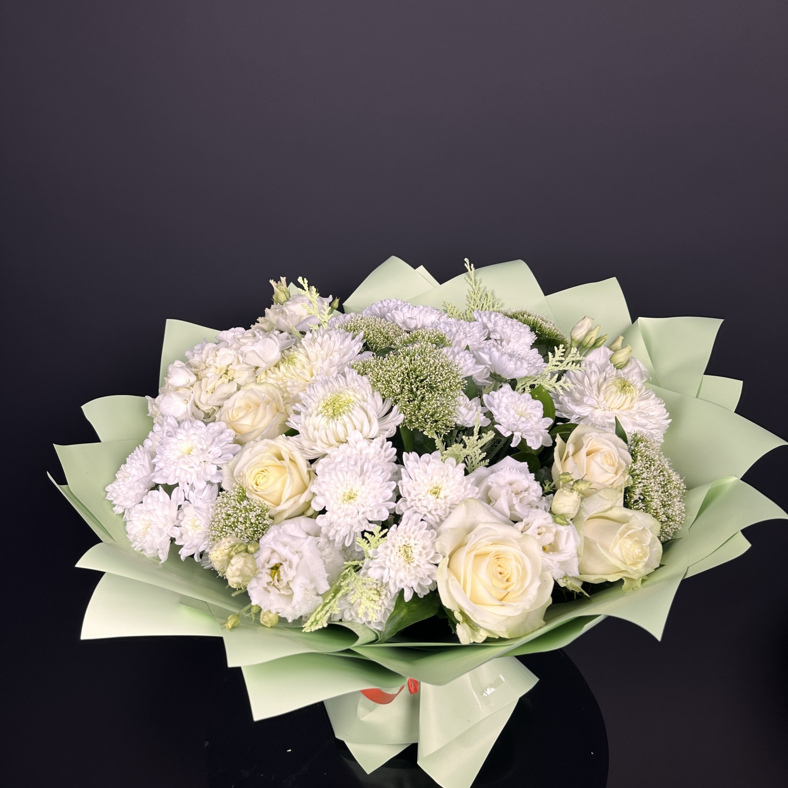 Состав: роза 5, хризантема кустовая 5, лизиантус 4, хризантема 3, гортензия 1, рускус 0,5 и прочее. под заказ