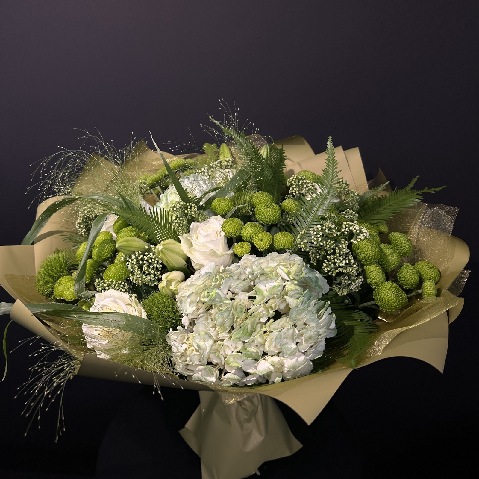 Состав: гвоздика 5, хризантема кустовая 5, аралия 3, лилия 2, гортензия 2 и прочее. под заказ