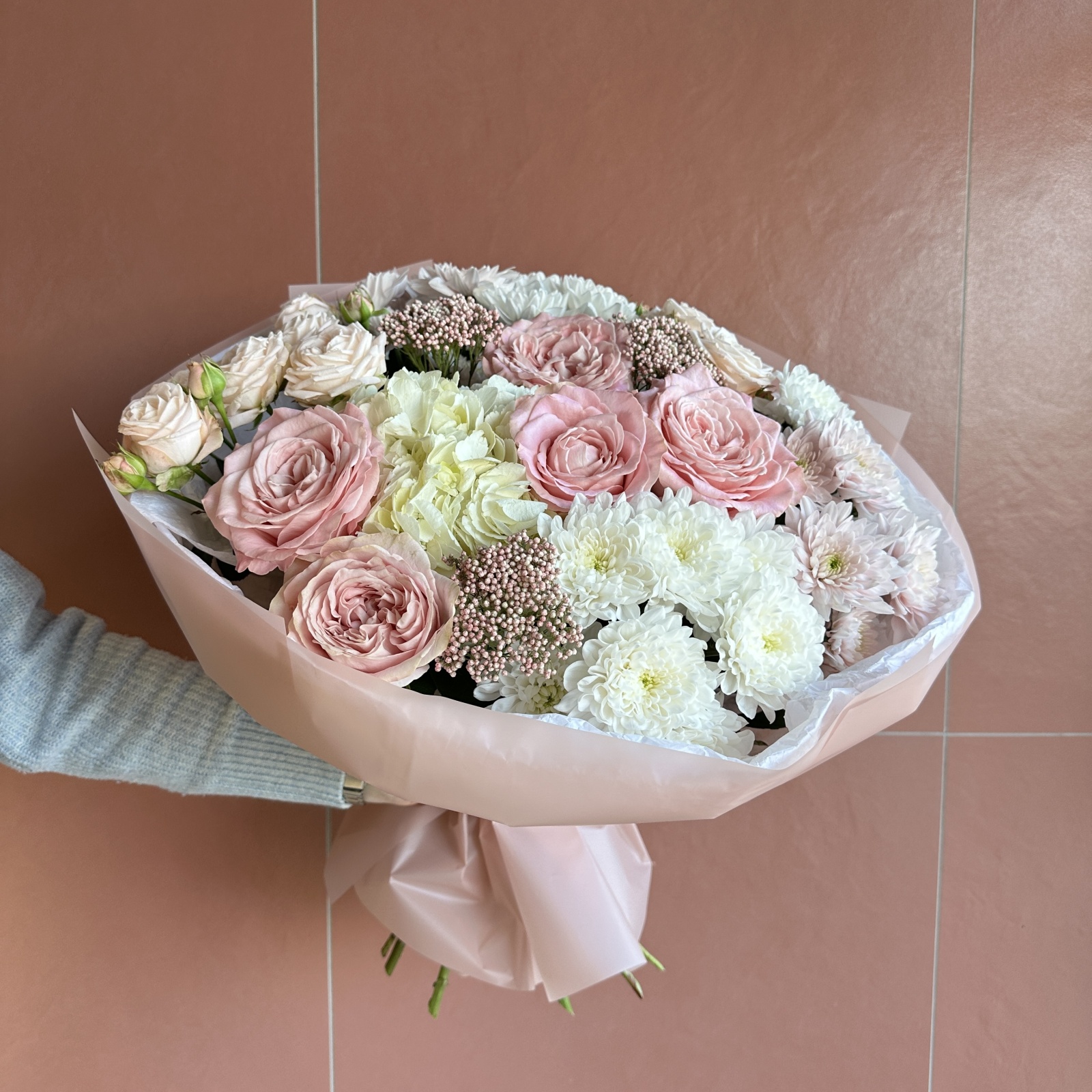Состав: хризантема кустовая 5, роза 4, роза кустовая 2, гортензия 1, салал 1 и прочее. в наличии