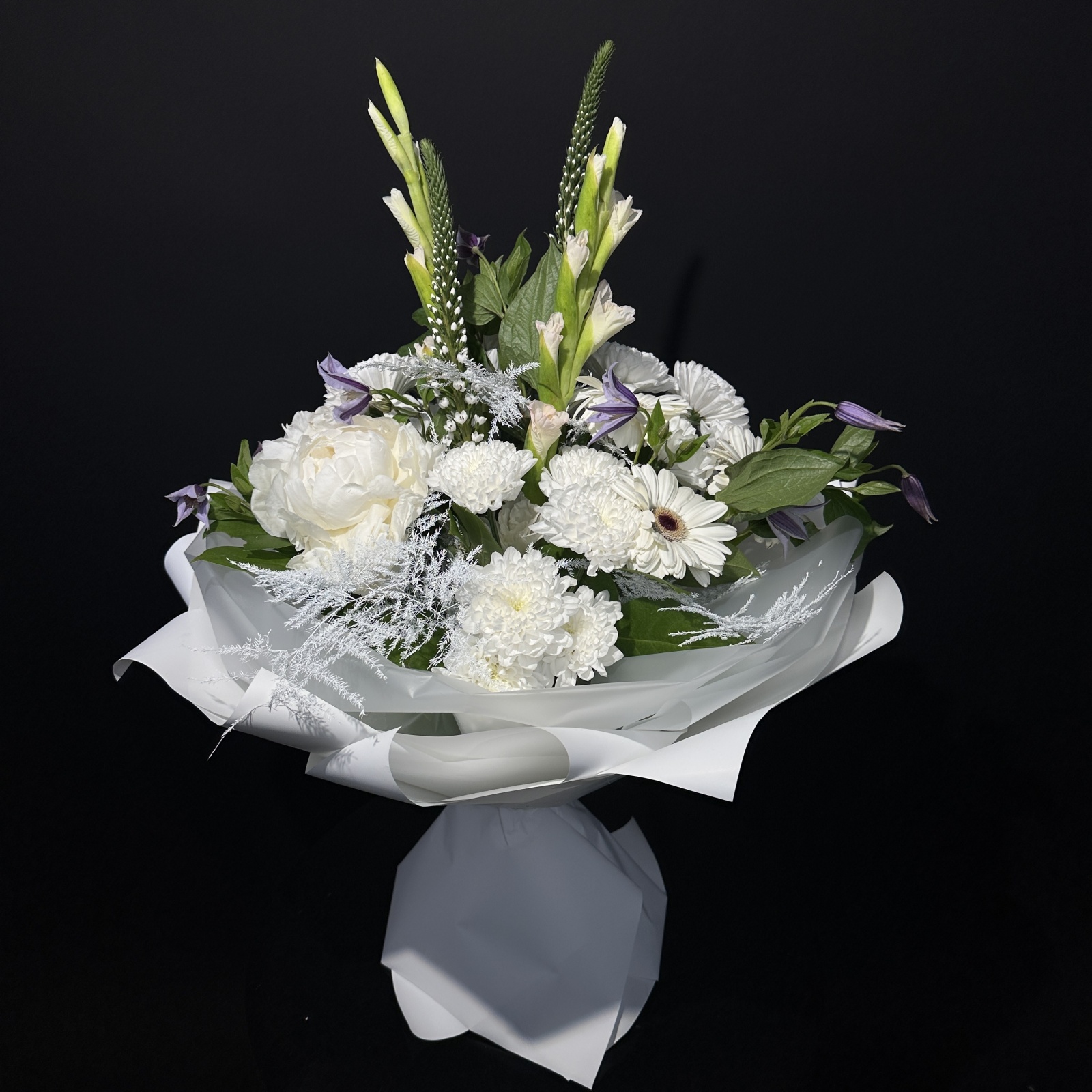 Состав: клематис 4, хризантема кустовая 4, гербера 3, гладиолус 2, лизимахия 2, пион 1, роза 1, салал 0,4 и прочее. под заказ