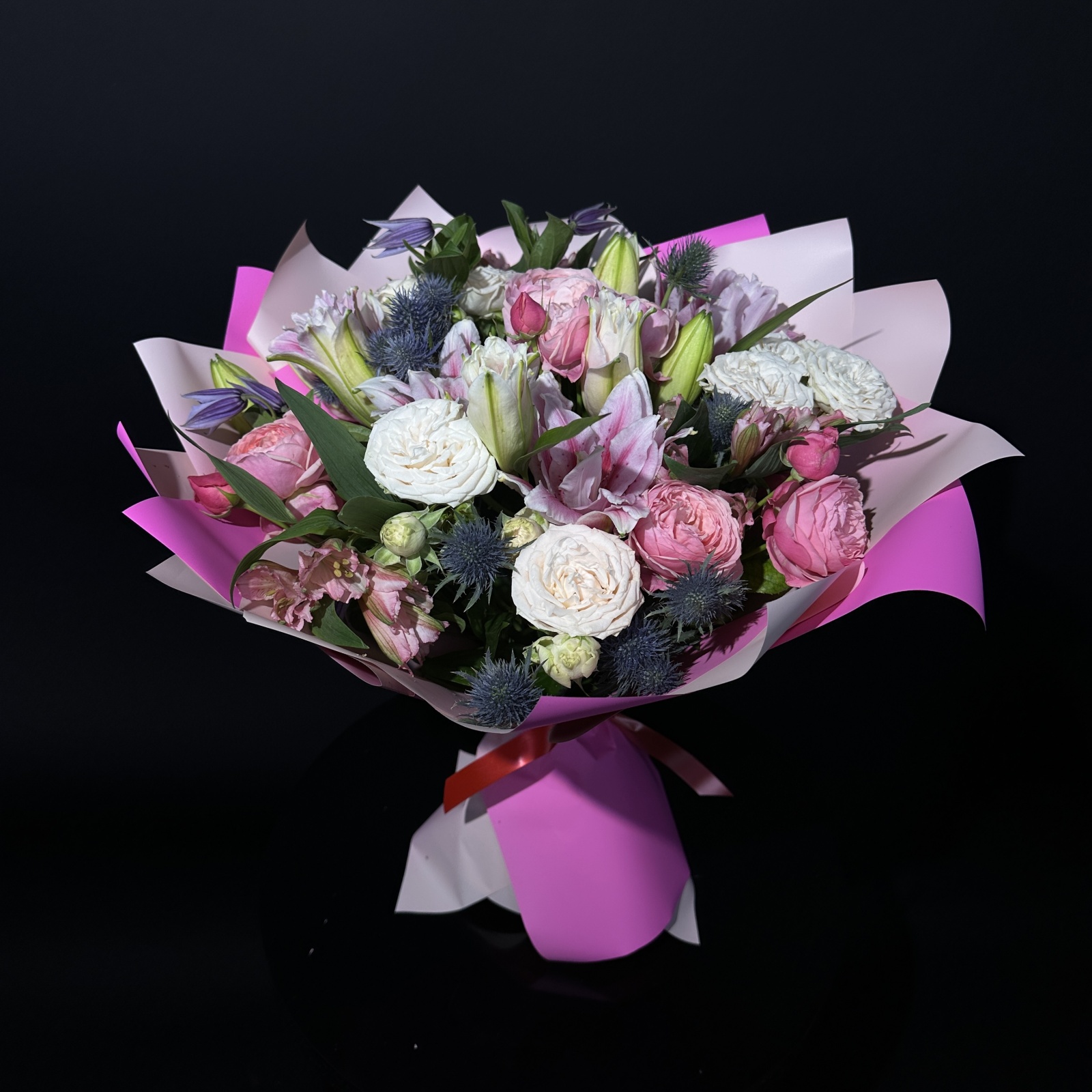 Состав: альстромерия 3, роза кустовая 3, лилия 3, эрингиум 3, клематис 2, рускус 0,5 и прочее.