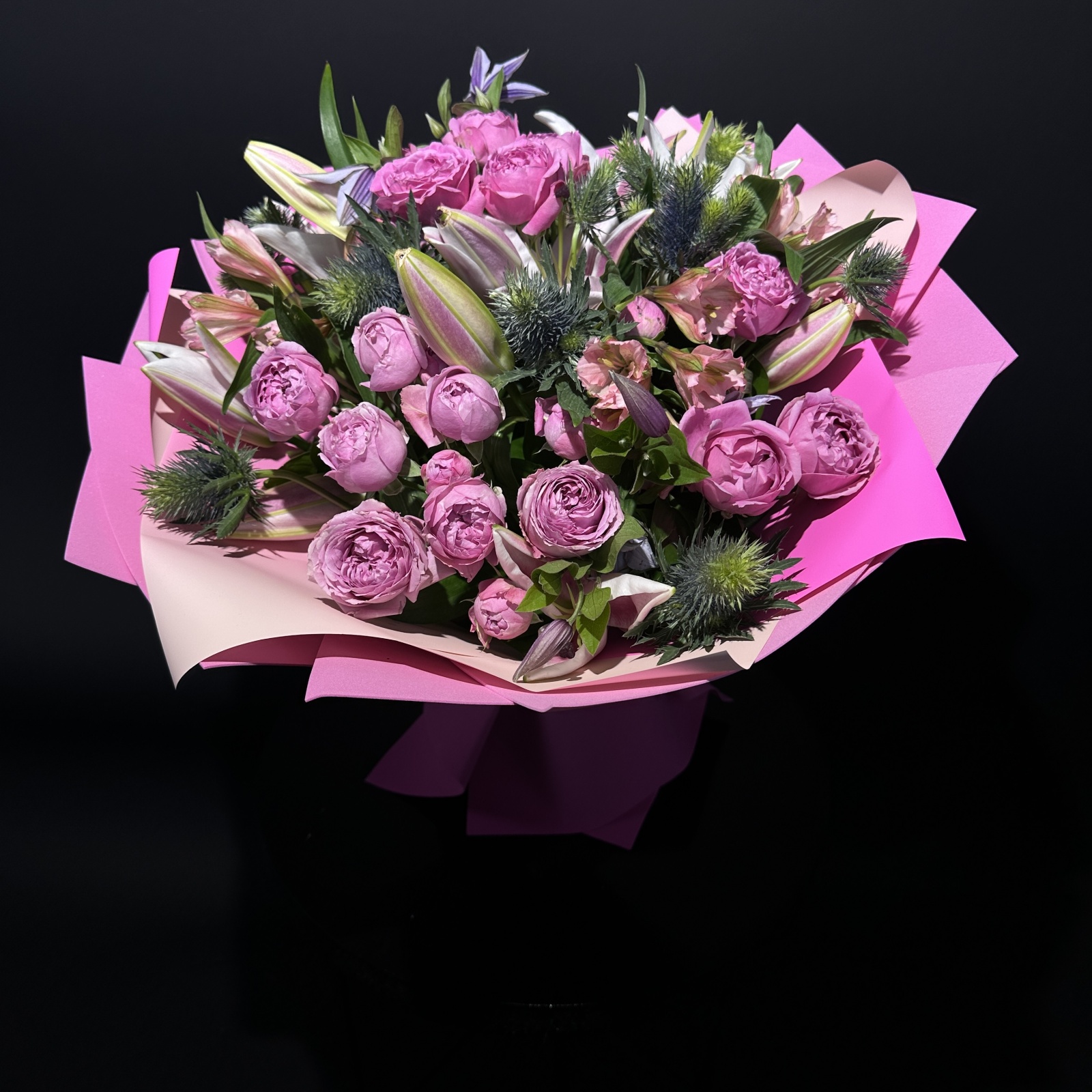 Состав: альстромерия 3, роза кустовая 3, лилия 3, эрингиум 2, клематис 2, рускус 0,5 и прочее. под заказ