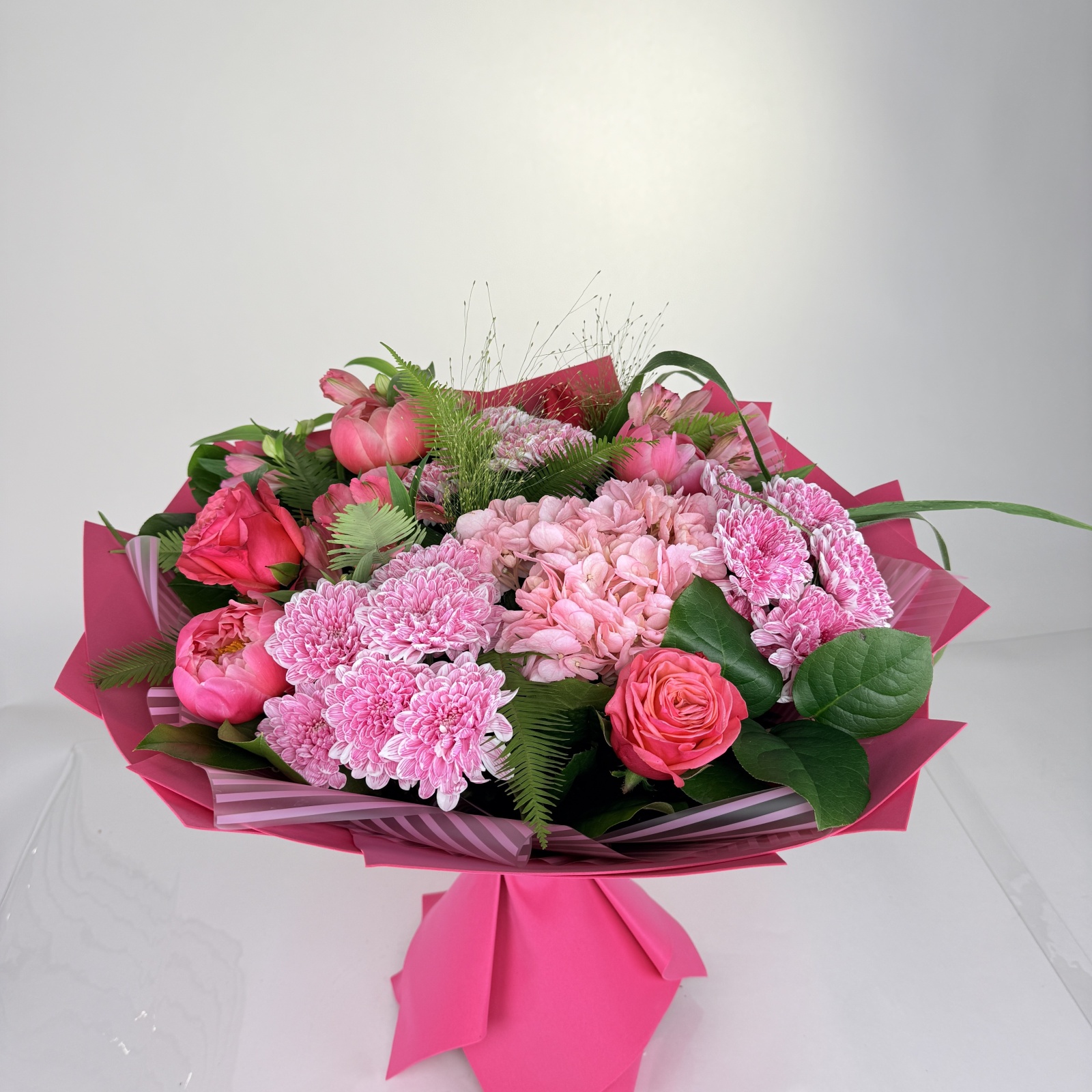 Состав: роза 3, альстромерия 3, хризантема кустовая 3, пион 3, хризантема 1, гортензия 1, салал 0,75 и прочее. под заказ