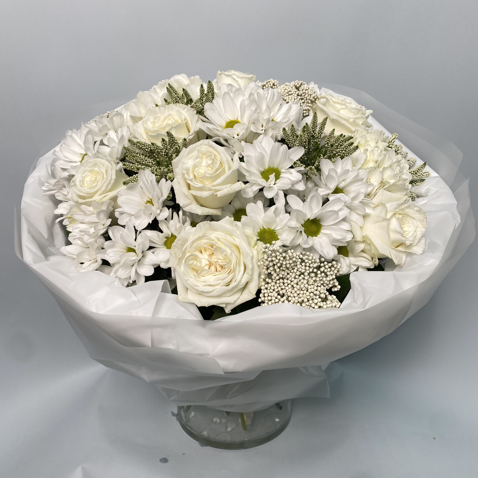 Состав: роза 7, хризантема кустовая 5, рускус 1 и прочее. в наличии