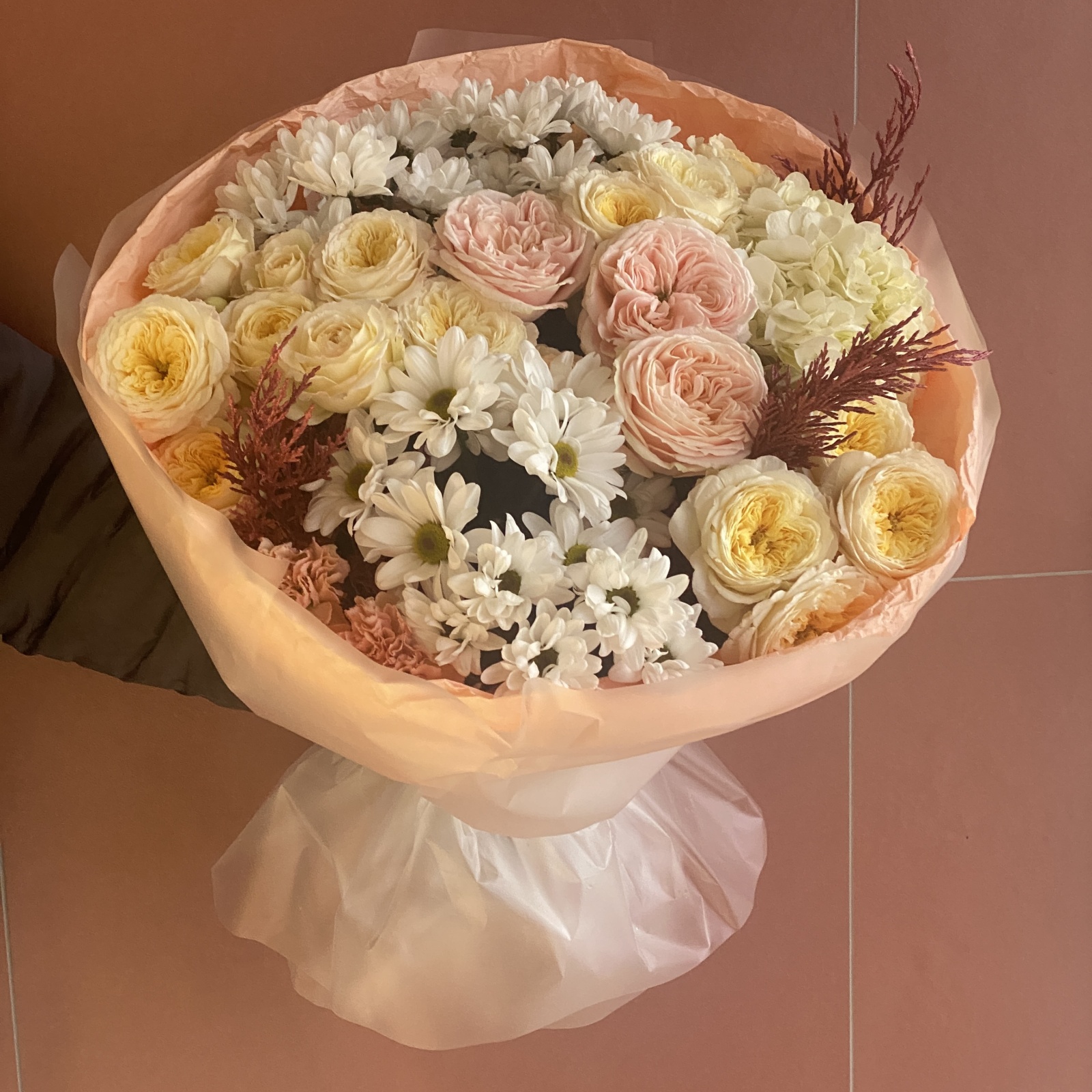 Состав: роза кустовая 4, хризантема кустовая 4, роза 3, гвоздика 2, гортензия 1, рускус 1 и прочее. в наличии