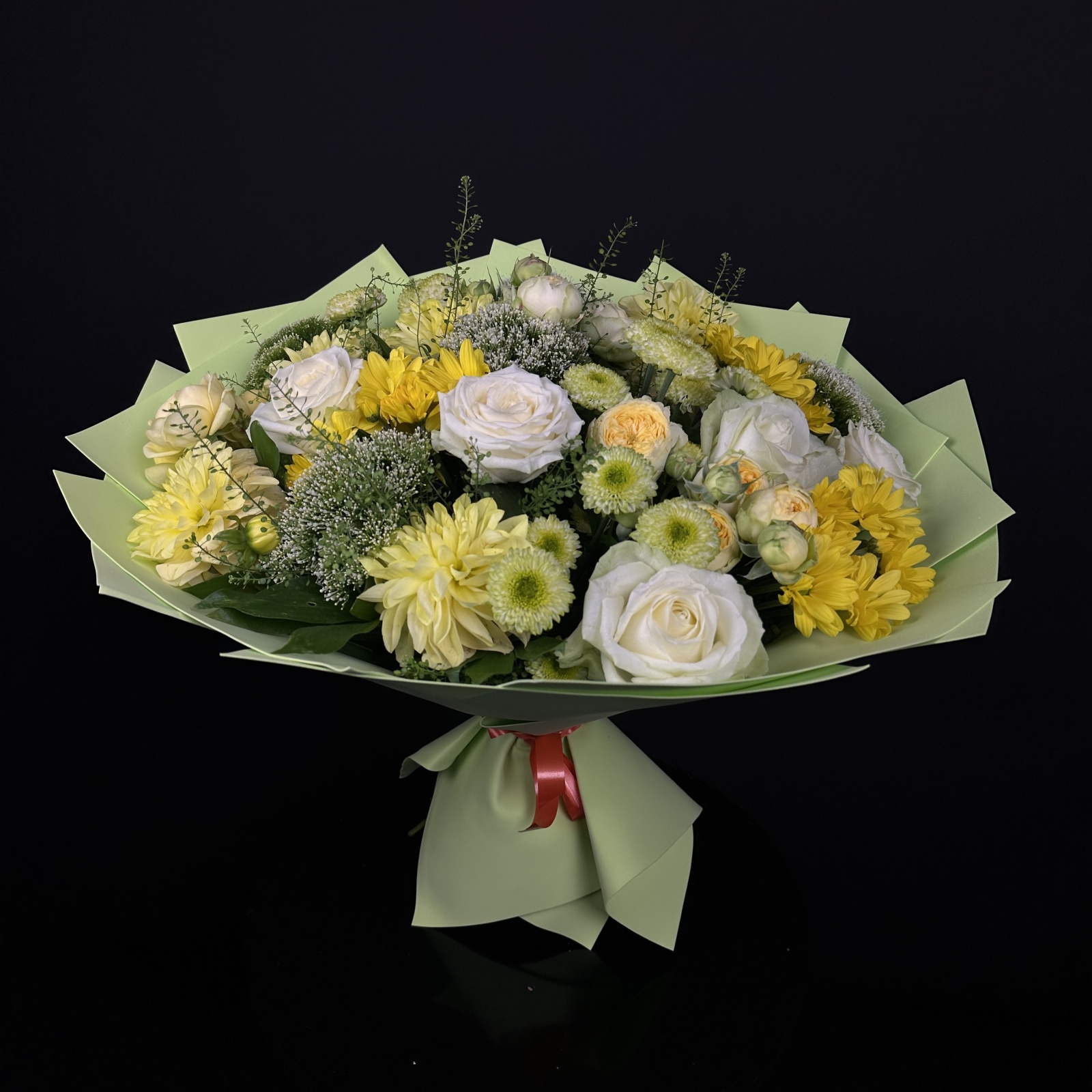 Состав: хризантема кустовая 6, роза 5, роза кустовая 3, рускус 0,5 и прочее.