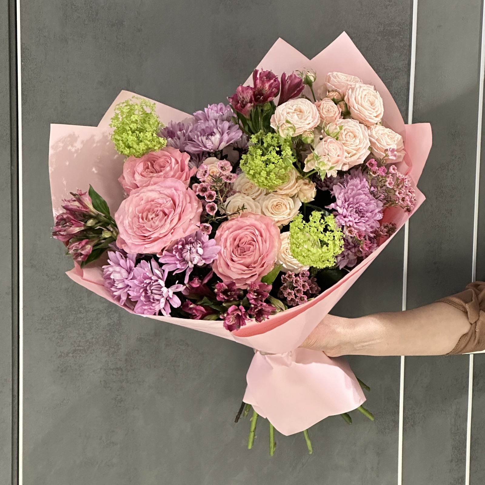 Состав: роза 3, альстромерия 3, хризантема кустовая 3, вибурнум 2, роза кустовая 2, рускус 0,5 и прочее. в наличии