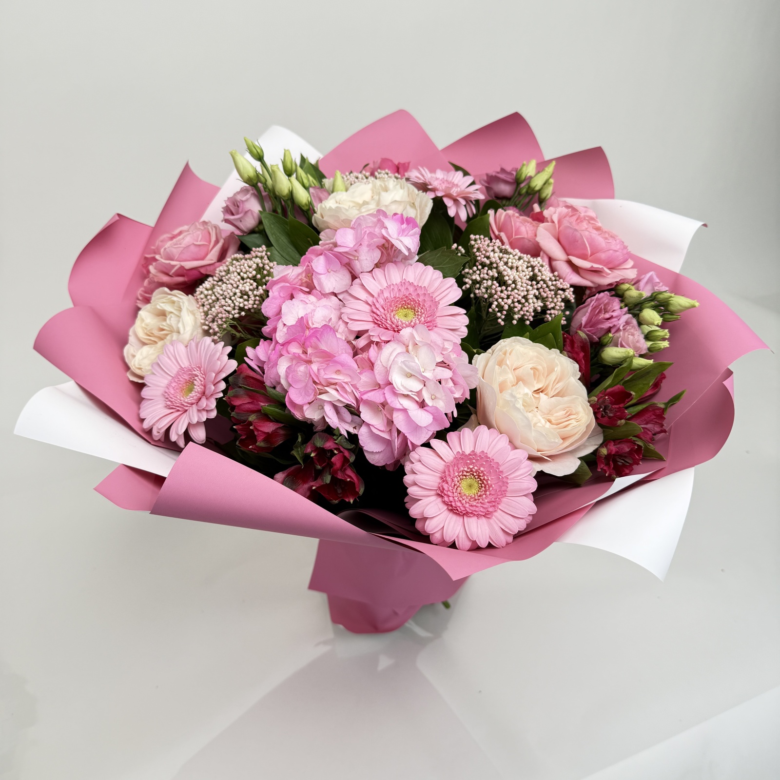 Состав: гербера 5, роза 3, альстромерия 3, роза кустовая 3, лизиантус 3, гортензия 1, рускус 0,5 и прочее. под заказ