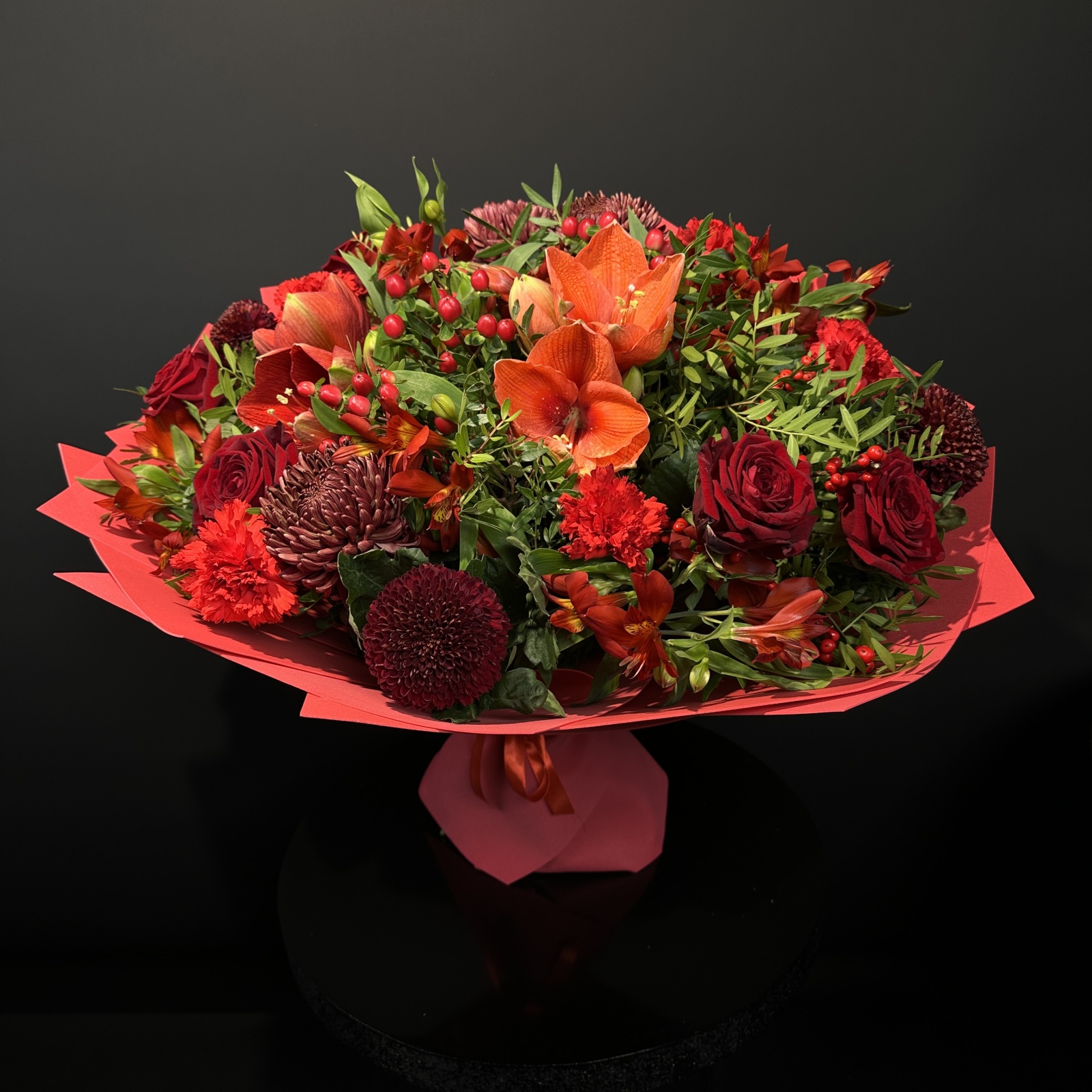 Состав: хризантема 5, роза 5, альстромерия 5, гвоздика 5, гиперикум 3, гиппеаструм 1, фисташка 1 и прочее. под заказ