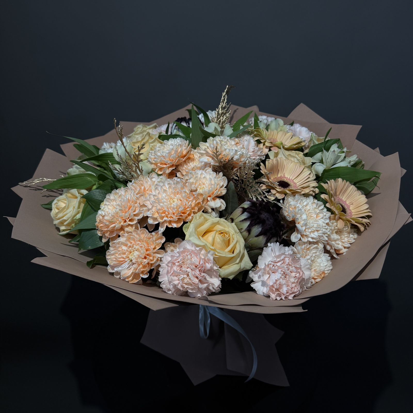 Состав: роза 7, гвоздика 6, хризантема кустовая 5, гербера 4, альстромерия 4, рускус 1 и прочее. под заказ