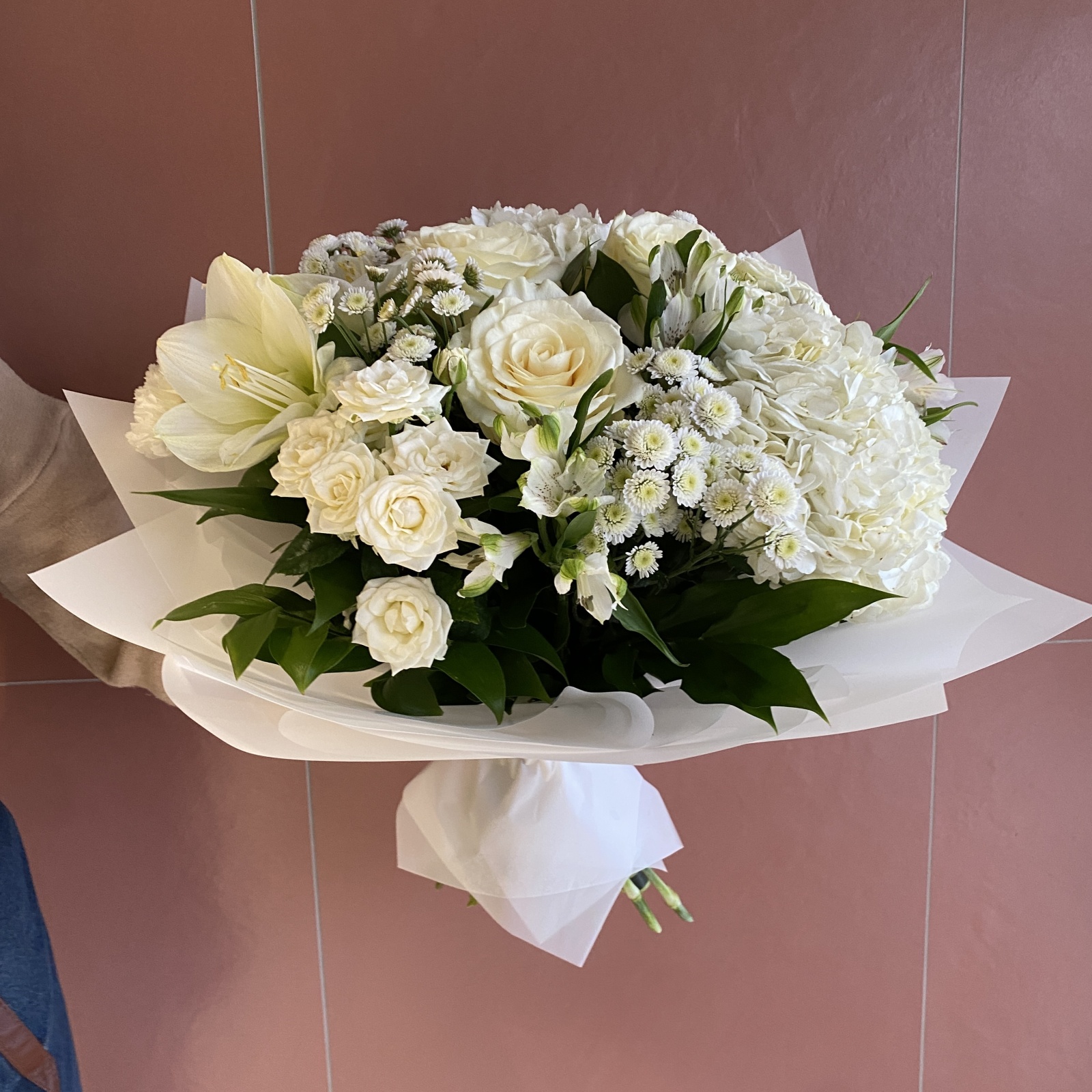 Состав: хризантема кустовая 5, роза 3, альстромерия 3, роза кустовая 3, гвоздика 2, гортензия 2, рускус 0,5 и прочее. в наличии