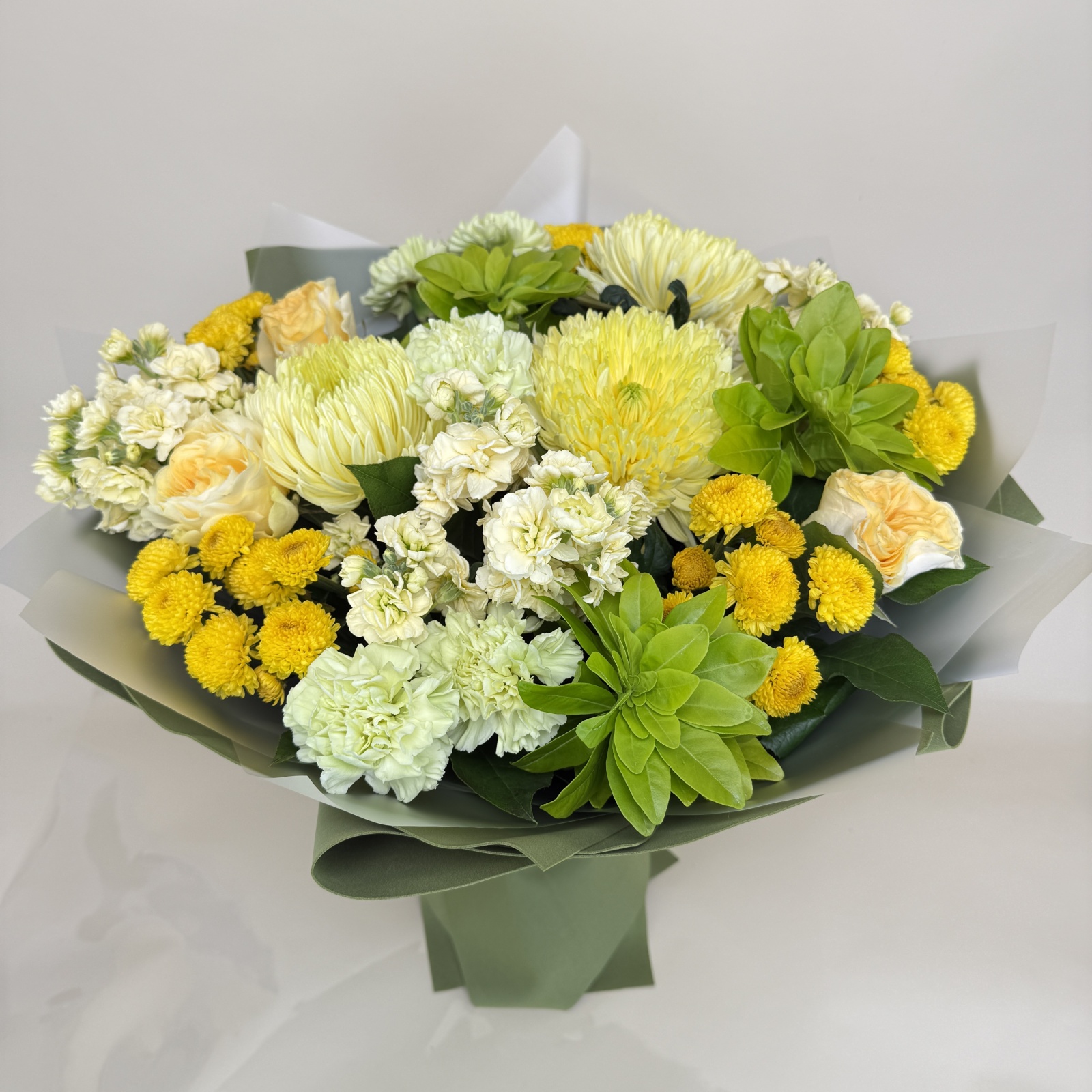 Состав: хризантема кустовая 10, гвоздика 5, чоисия 3, маттиола 3, хризантема 3, роза 3, салал 0,5 и прочее. под заказ