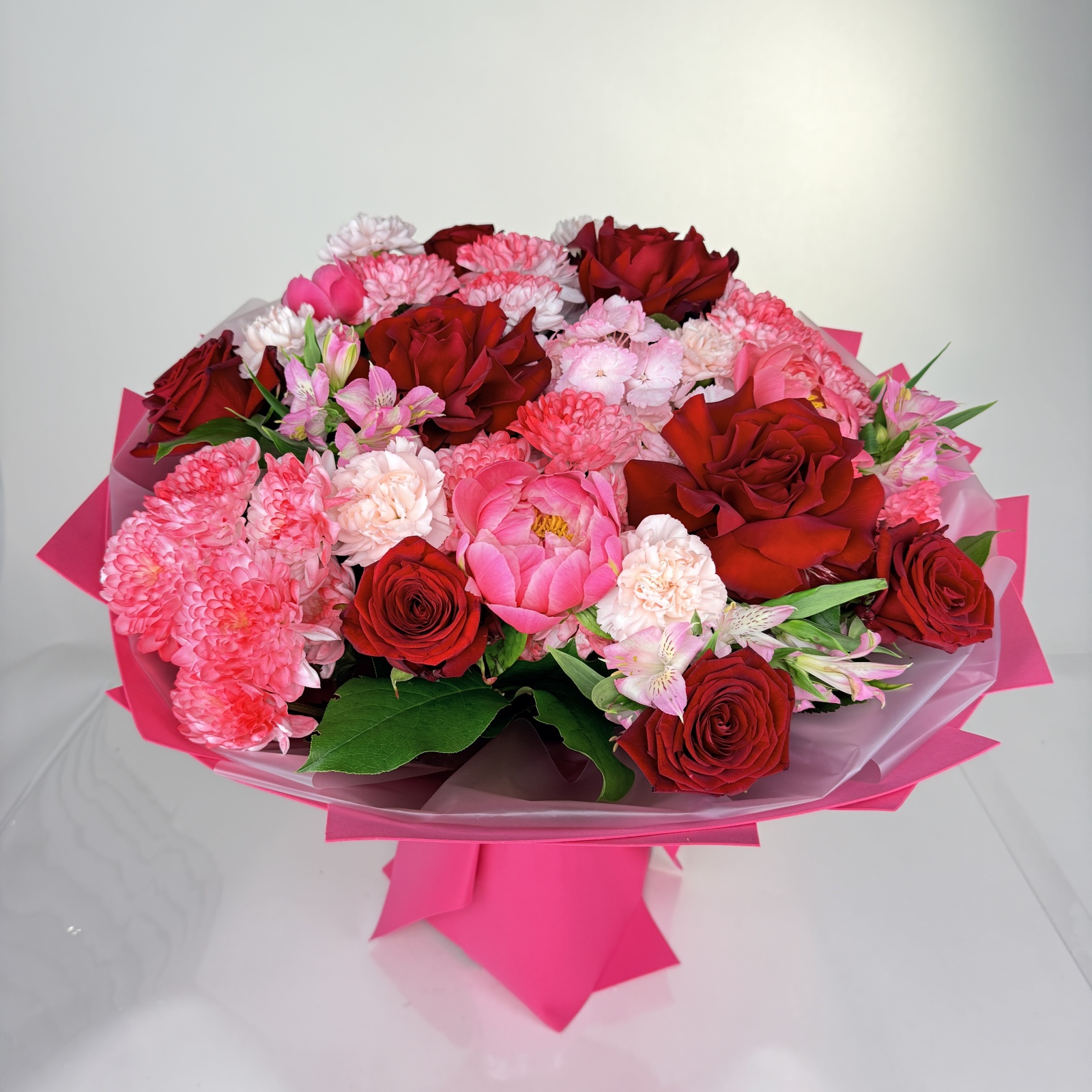 Состав: роза 8, гвоздика 7, хризантема кустовая 5, альстромерия 3, пион 3, гортензия 1, салал 0,7 и прочее.