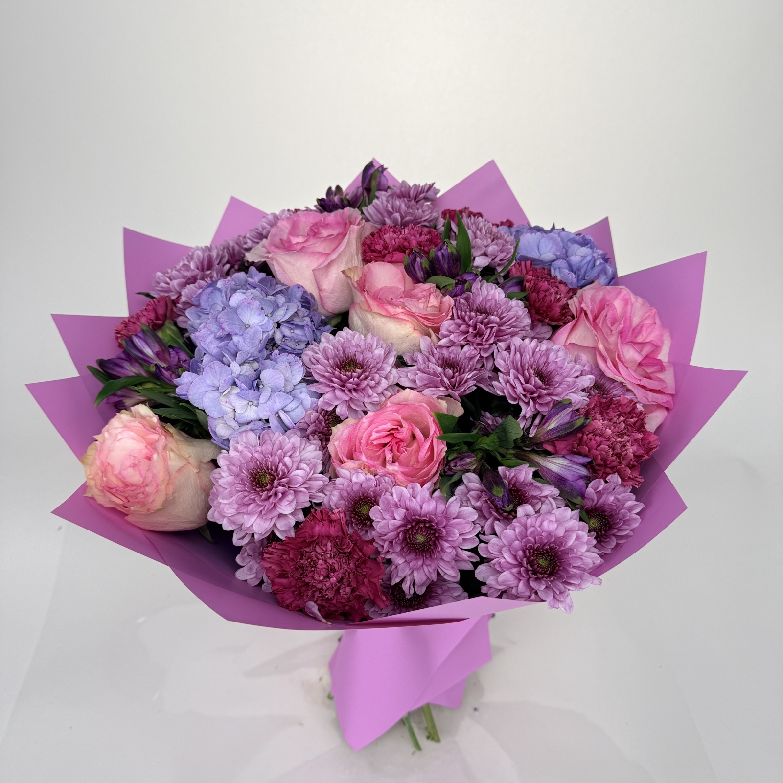 Состав: гвоздика 6, хризантема кустовая 5, роза 5, альстромерия 4, гортензия 2, рускус 0,5 и прочее.