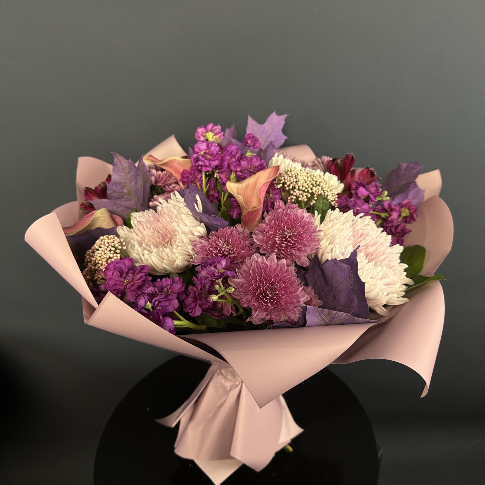 Состав: роза 7, хризантема кустовая 4, анемон 3, альстромерия 3, клематис 3, статица 2, рускус 0,5 и прочее. под заказ
