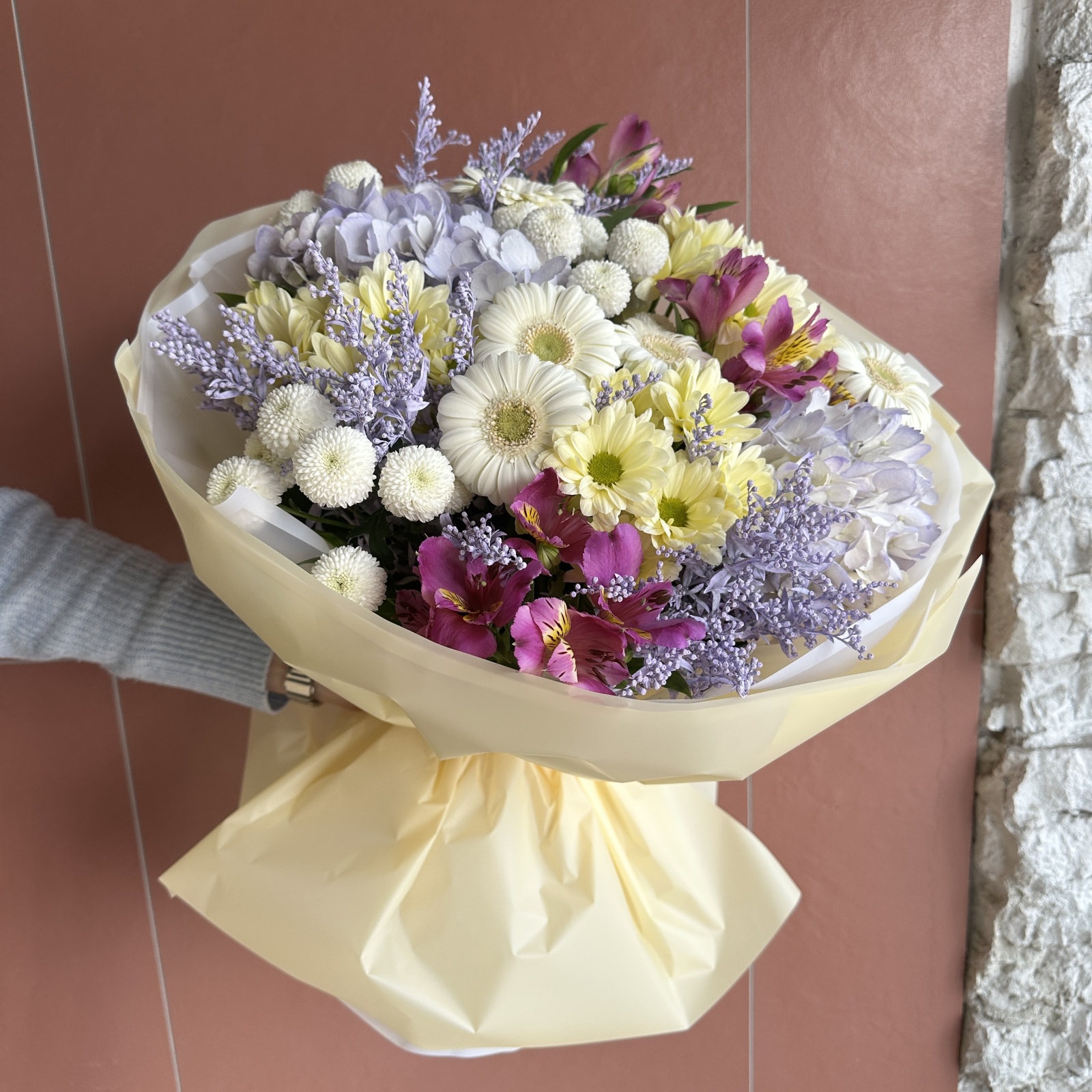Состав: хризантема кустовая 6, гербера 5, альстромерия 3, солидаго 3, гортензия 2, рускус 0,5 и прочее. в наличии