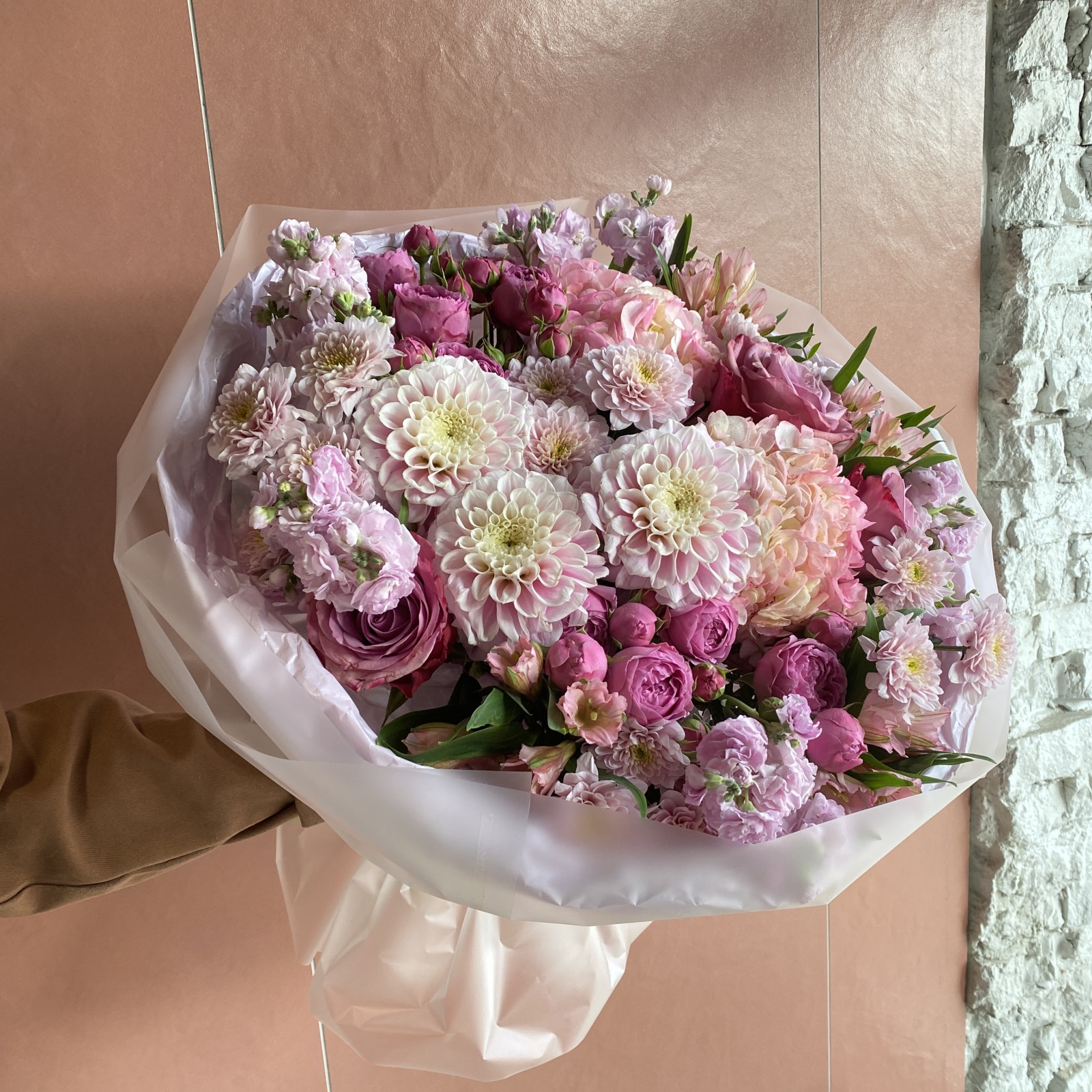 Состав: маттиола 5, хризантема кустовая 4, альстромерия 4, роза 3, роза кустовая 2, гортензия 2, фисташка 1 и прочее. в наличии