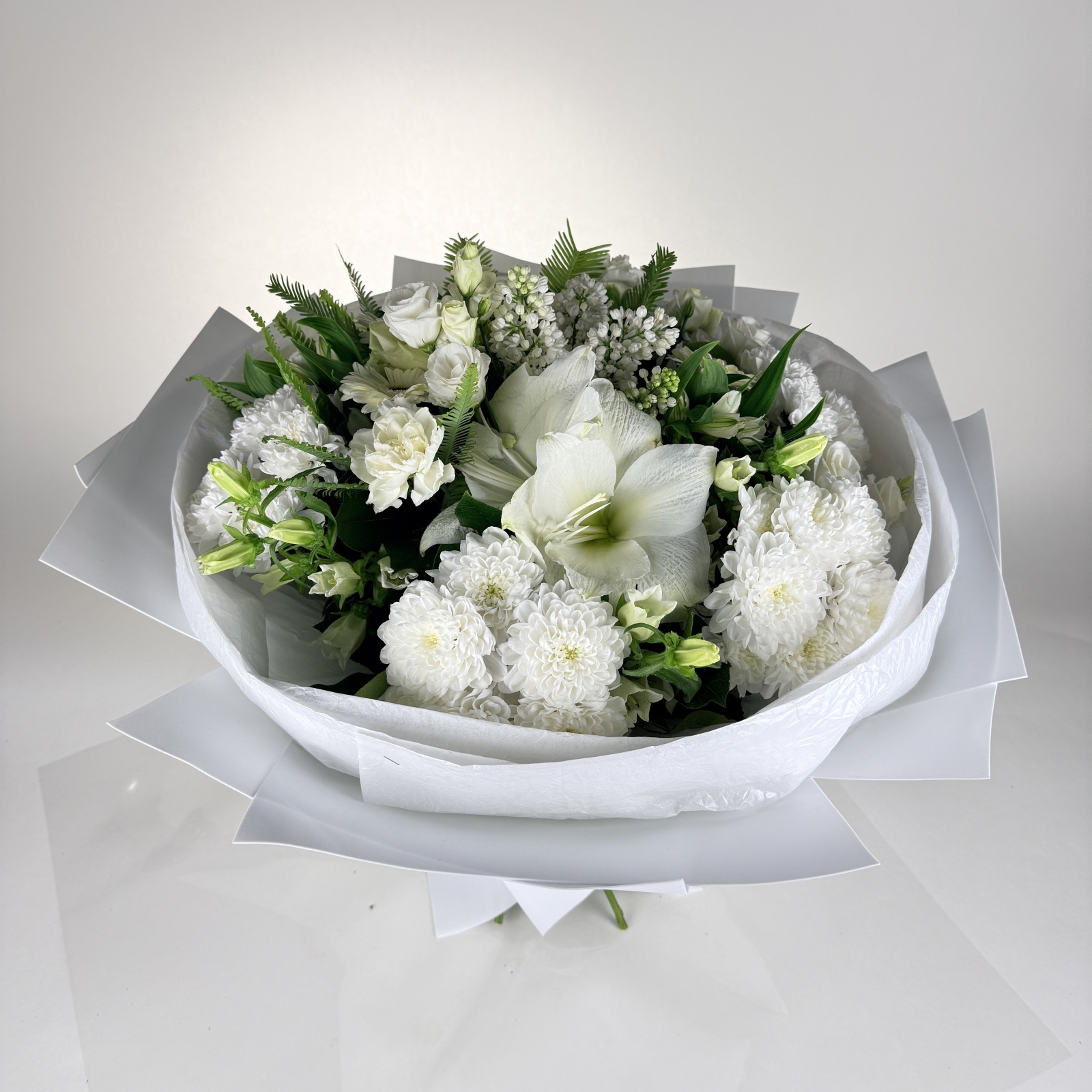 Состав: хризантема кустовая 4, гербера 3, роза 3, альстромерия 3, гвоздика 3, лизиантус 2, салал 1, сирень 1, гортензия 1 и прочее. под заказ