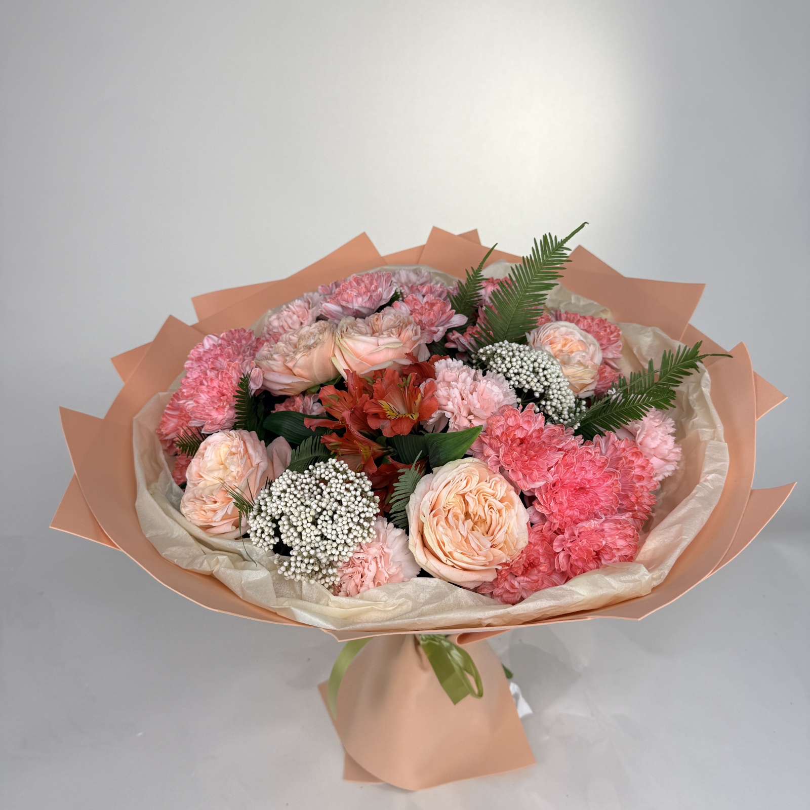 Состав: роза 6, гвоздика 5, хризантема кустовая 5, альстромерия 1, рускус 0,5 и прочее. под заказ