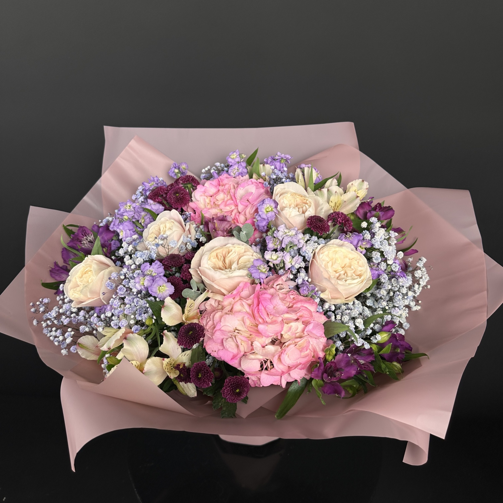 Состав: маттиола 9, альстромерия 6, хризантема 5, роза 5, гортензия 2 и прочее. под заказ