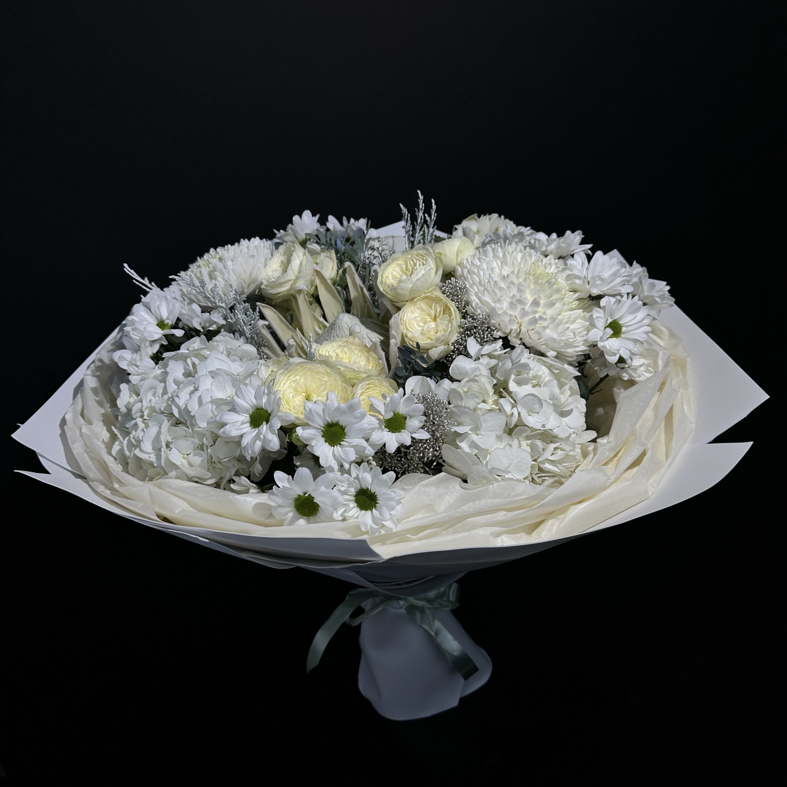 Состав: хризантема кустовая 5, гортензия 3, роза кустовая 3, хризантема 2 и прочее. под заказ