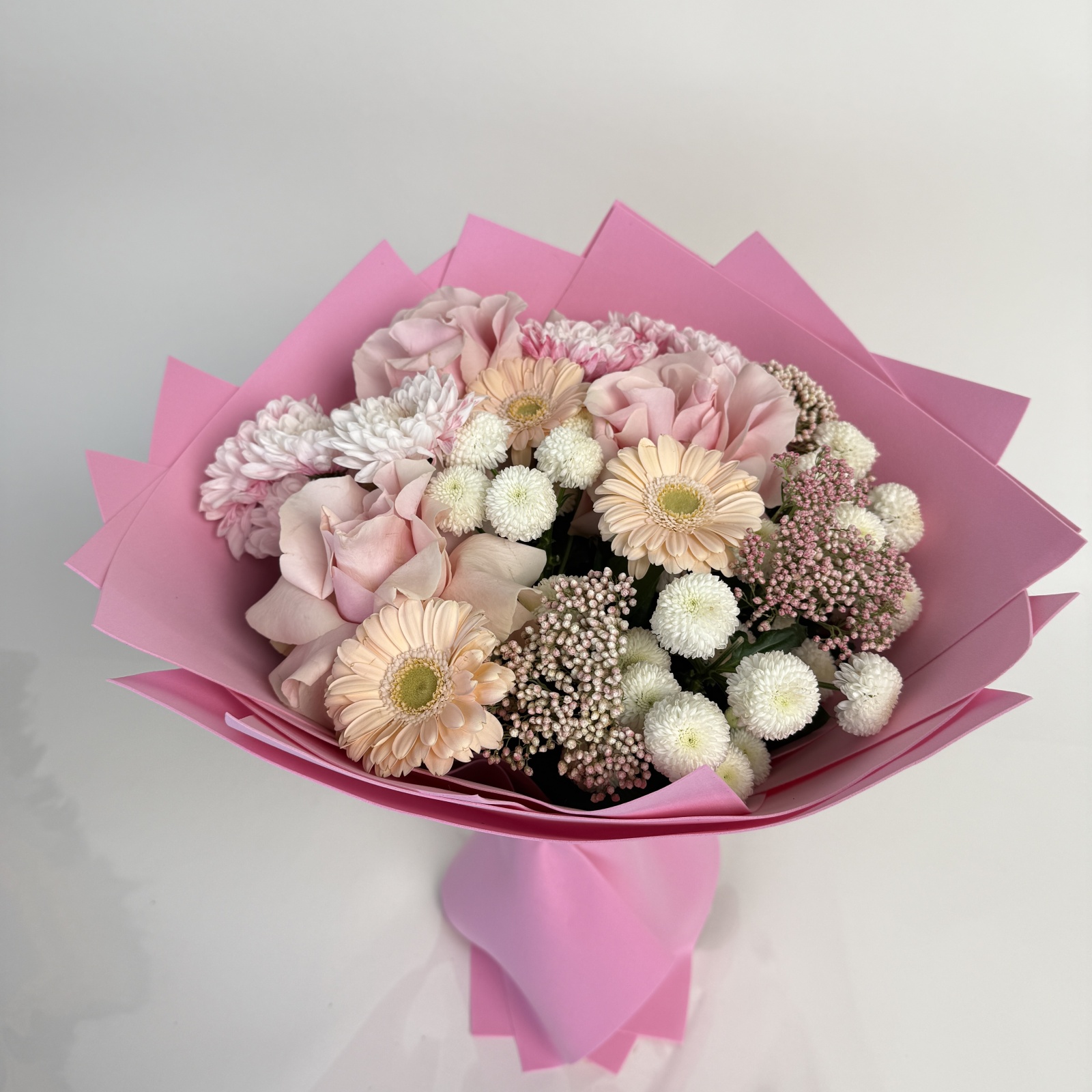 Состав: хризантема кустовая 5, роза 4, гербера 3, рускус 0,5 и прочее. под заказ