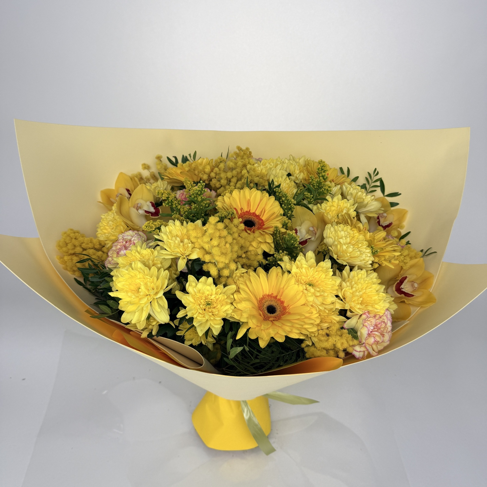 Состав: гвоздика 7, хризантема кустовая 5, гербера 5, солидаго 2, маттиола 1, фисташка 0,5, ветка цимбидиум 0,4 и прочее. под заказ