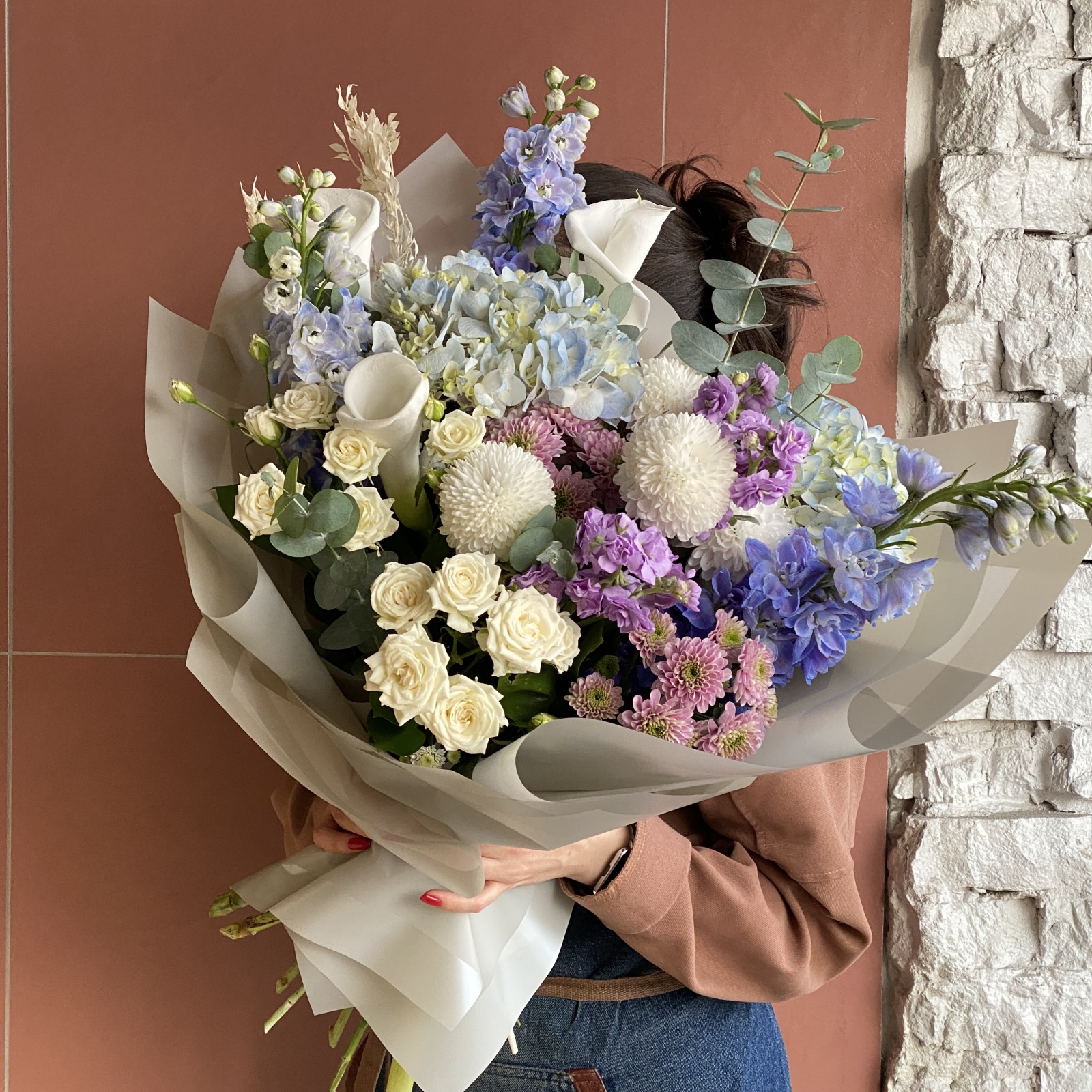 Состав: хризантема 4, хризантема кустовая 3, дельфиниум 3, рускус 2,5, маттиола 2, гортензия 2, роза кустовая 2, эвкалипт 1 и прочее. в наличии