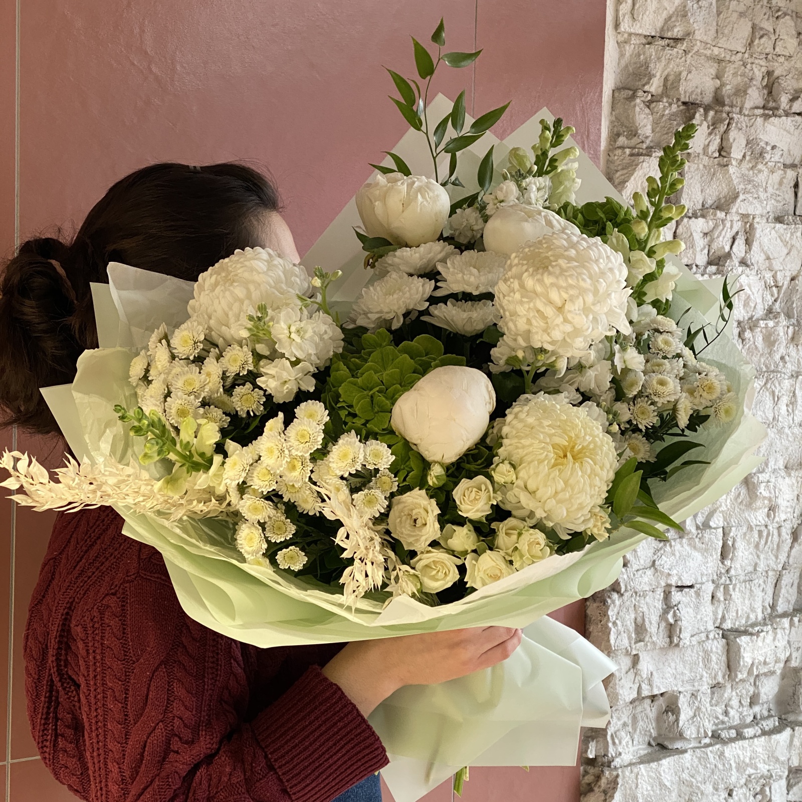 Состав: хризантема 3, хризантема кустовая 3, антирринум 3, рускус 3, маттиола 3, пион 3, гортензия 2, роза кустовая 1 и прочее. в наличии