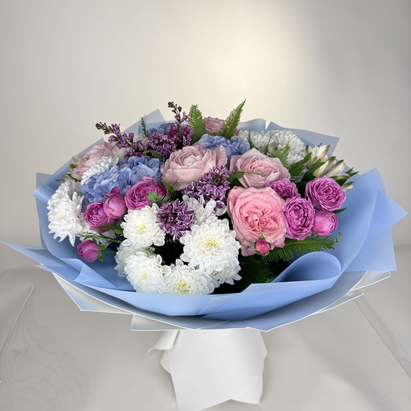 Состав: роза 5, хризантема кустовая 5, гортензия 3, альстромерия 3, роза кустовая 3, сирень 2, салал 0,5 и прочее.