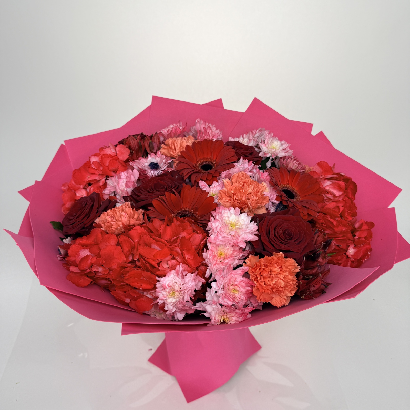 Состав: гербера 7, роза 5, гвоздика 5, хризантема кустовая 5, гортензия 3, альстромерия 2 и прочее. под заказ