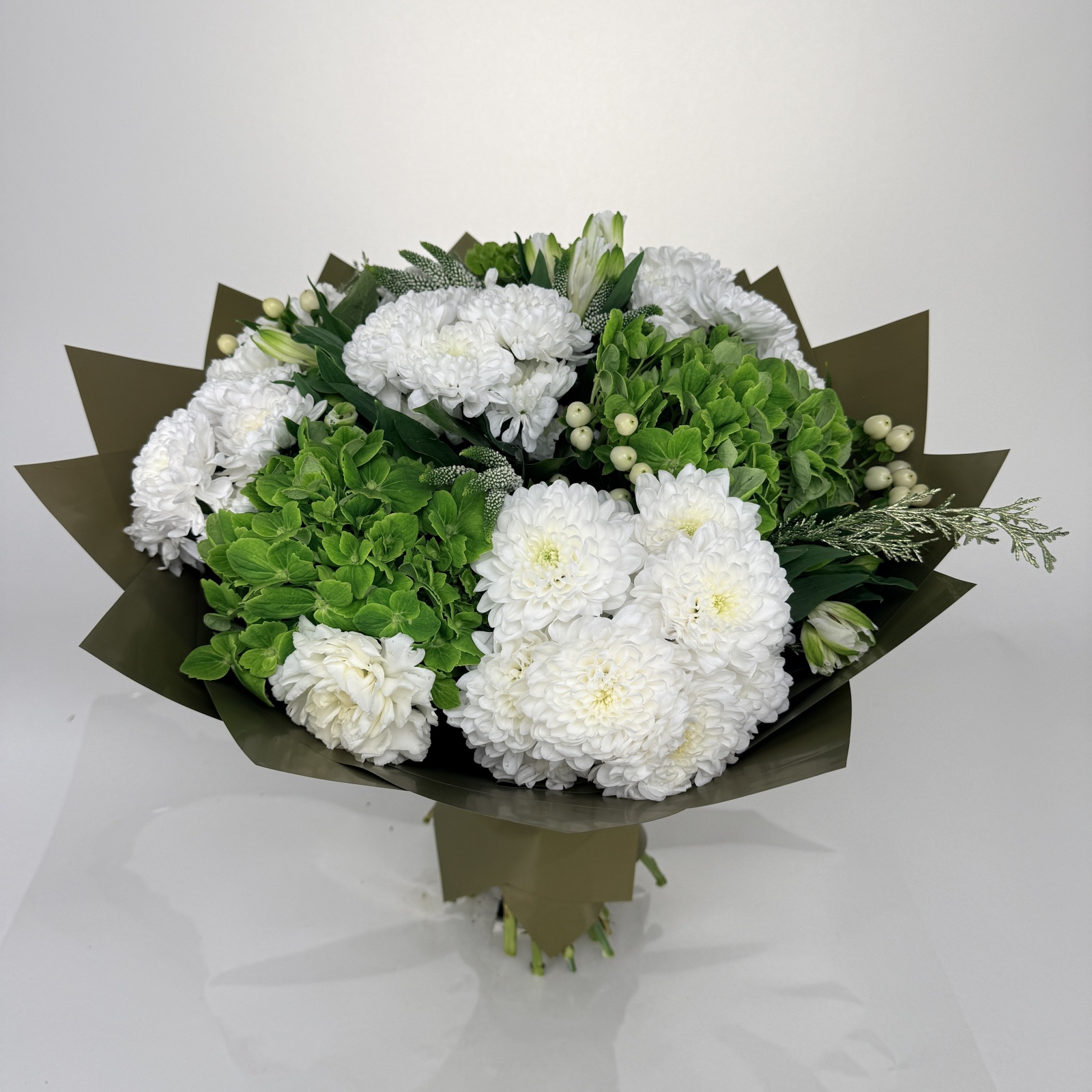 Состав: хризантема кустовая 5, гвоздика 4, гортензия 3, гиперикум 3, альстромерия 3, рускус 1 и прочее. под заказ