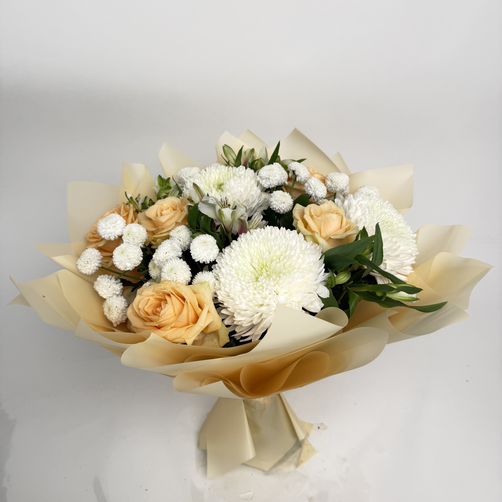 Состав: роза 5, хризантема кустовая 5, альстромерия 4, хризантема 3, рускус 0,5 и прочее. под заказ
