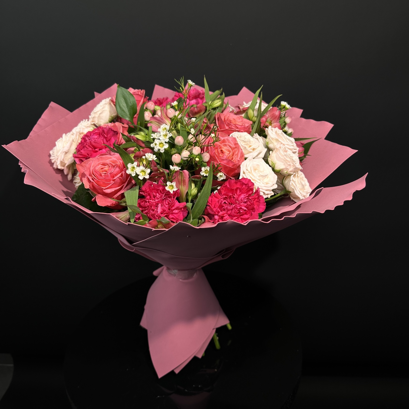 Состав: роза 5, альстромерия 5, гвоздика 5, роза кустовая 3, гиперикум 3, рускус 1, хамелациум 1 и прочее. под заказ