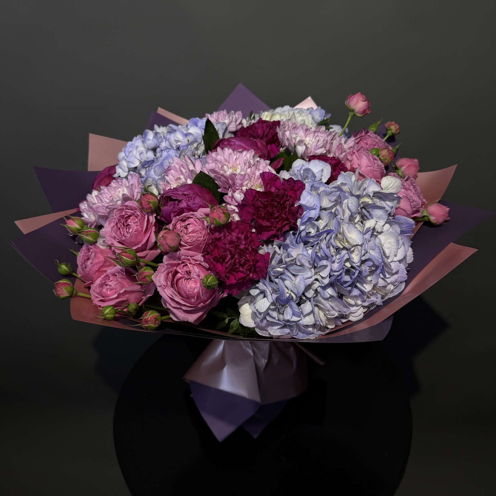 Состав: гвоздика 5, хризантема кустовая 4, гортензия 3, пион 3, роза кустовая 2, рускус 0,5 и прочее. под заказ
