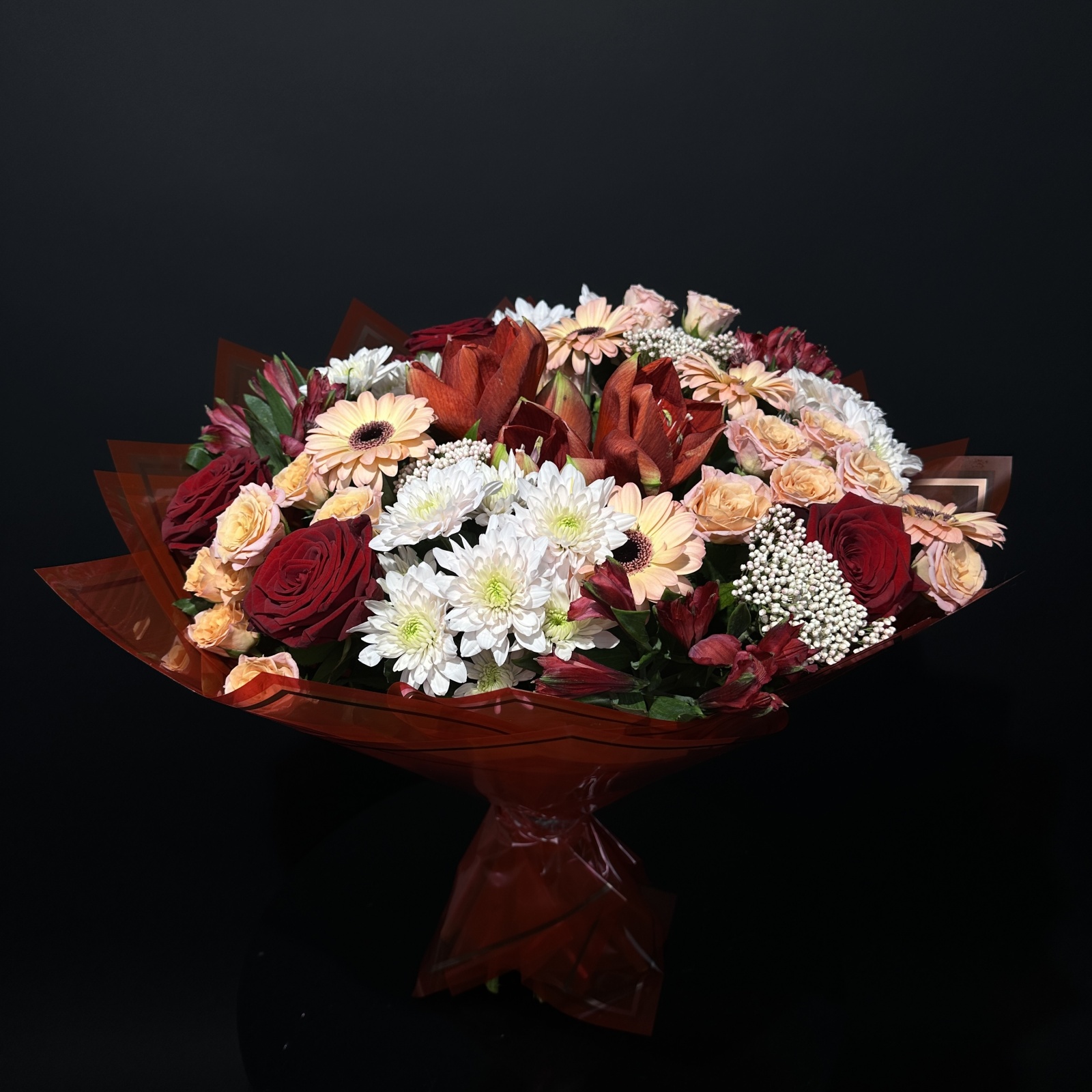 Состав: роза 6, гербера 6, альстромерия 5, хризантема кустовая 5, роза кустовая 3, гиппеаструм 1, рускус 0,5 и прочее. под заказ