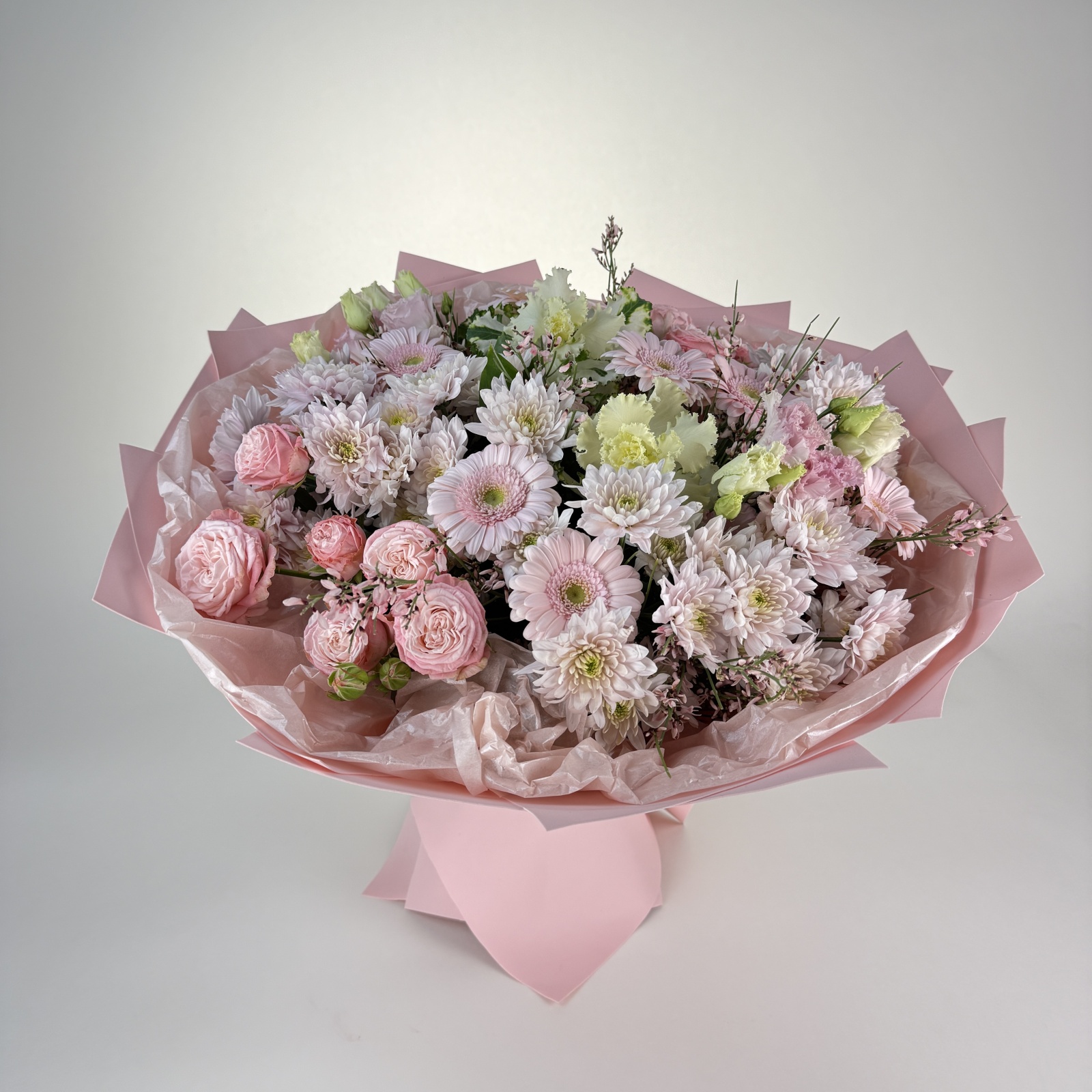 Состав: гербера 7, хризантема кустовая 5, роза кустовая 2, лизиантус 2, рускус 1 и прочее. под заказ