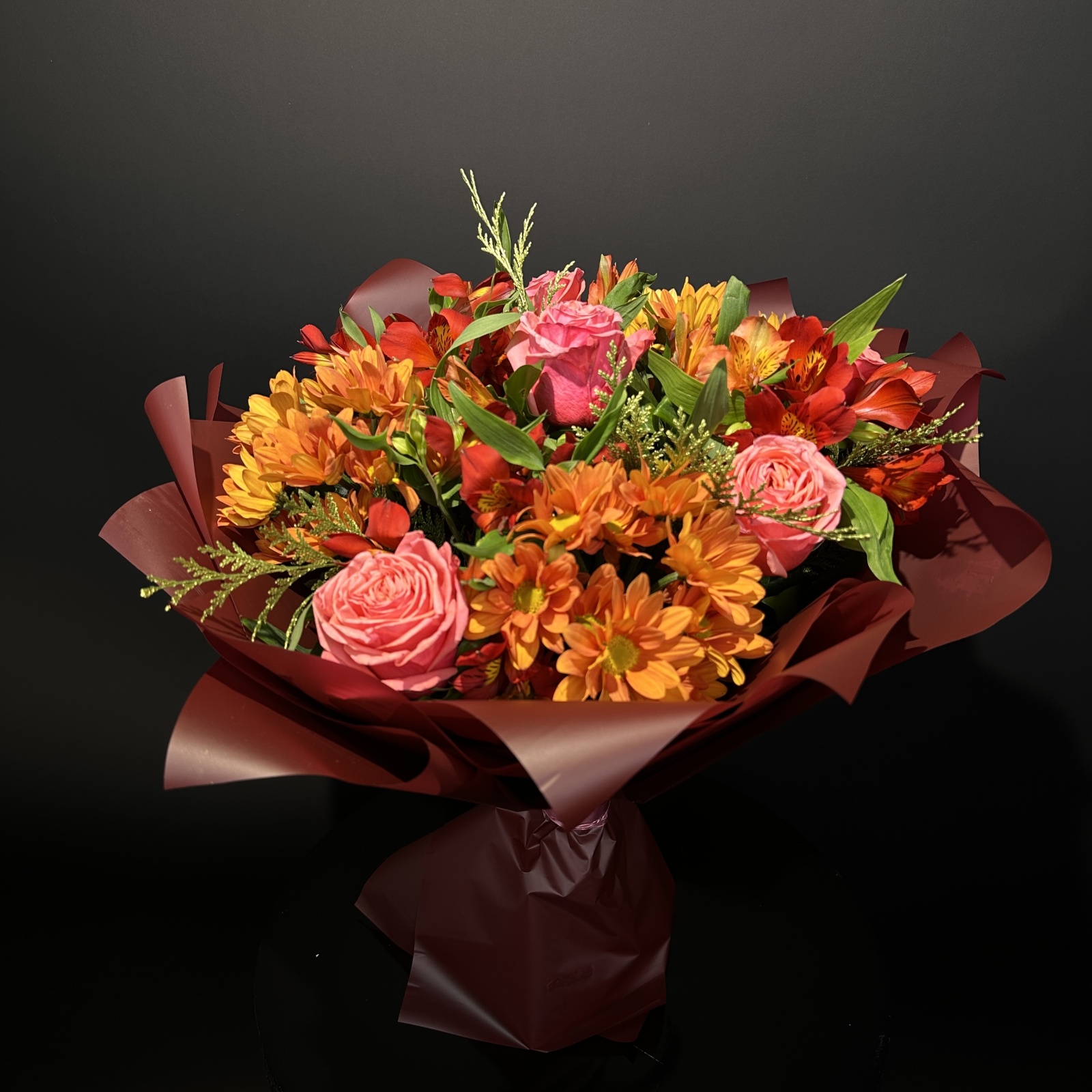 Состав: альстромерия 6, роза 5, хризантема кустовая 3, рускус 0,5 и прочее. под заказ