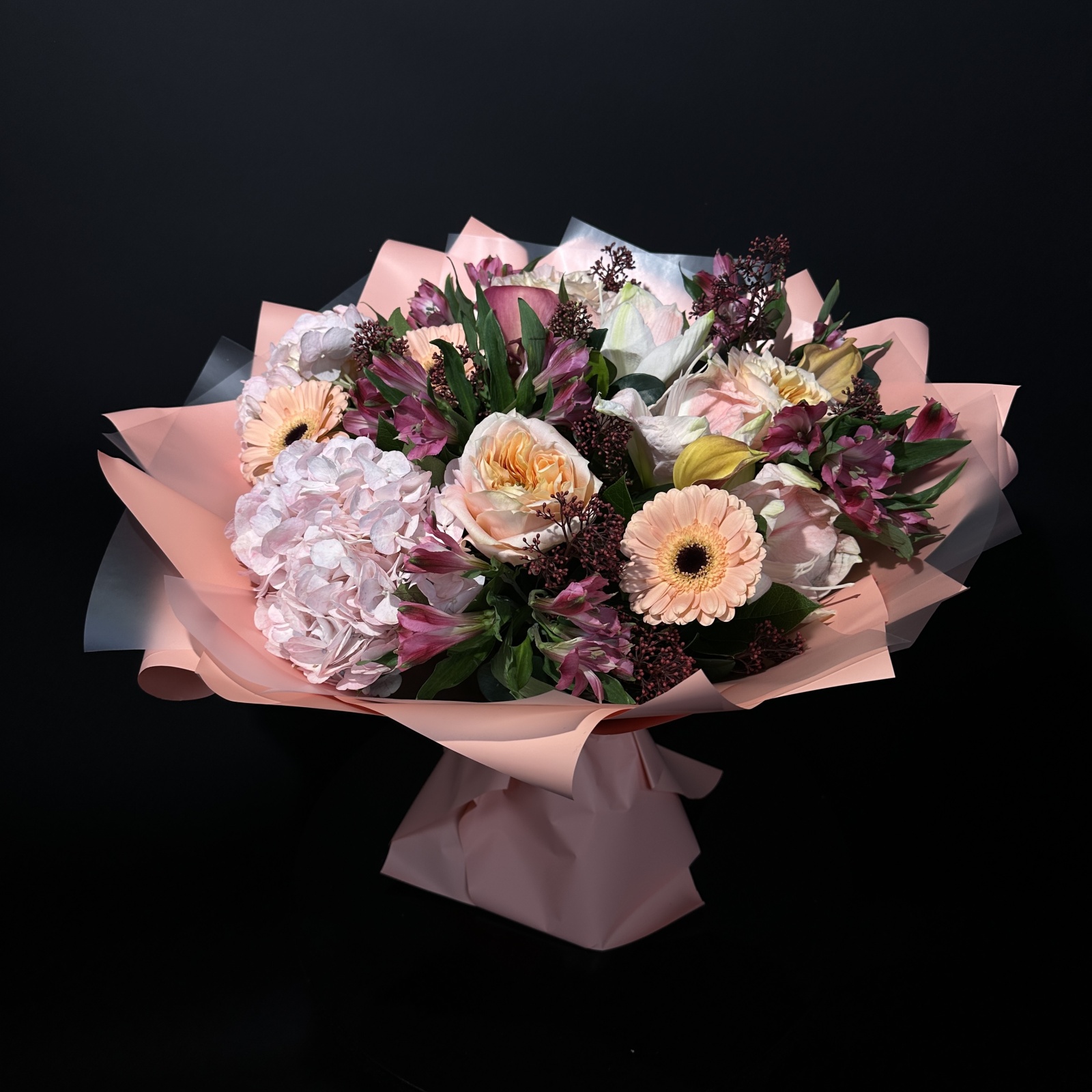 Состав: альстромерия 4, гербера 3, роза 3, гортензия 2, лизиантус 2, салал 1 и прочее. под заказ
