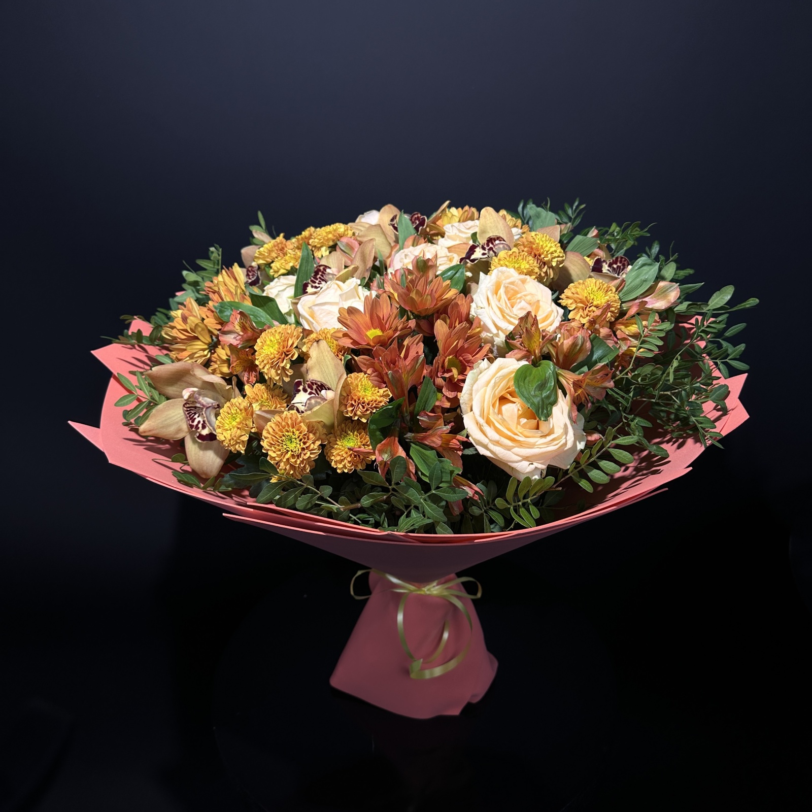 Состав: роза 7, альстромерия 6, хризантема кустовая 6, фисташка 1, ветка цимбидиум 0,5 и прочее. под заказ