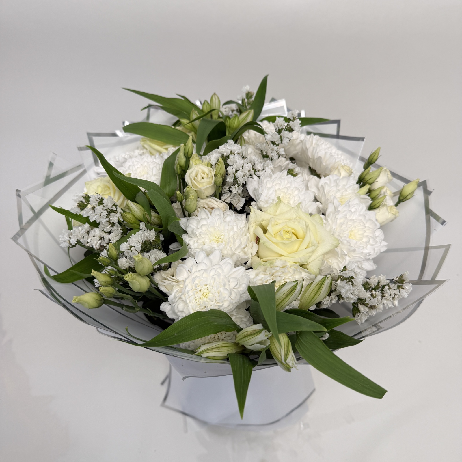 Состав: хризантема кустовая 4, роза 3, альстромерия 3, лизиантус 3, статица 2, рускус 0,5 и прочее. под заказ