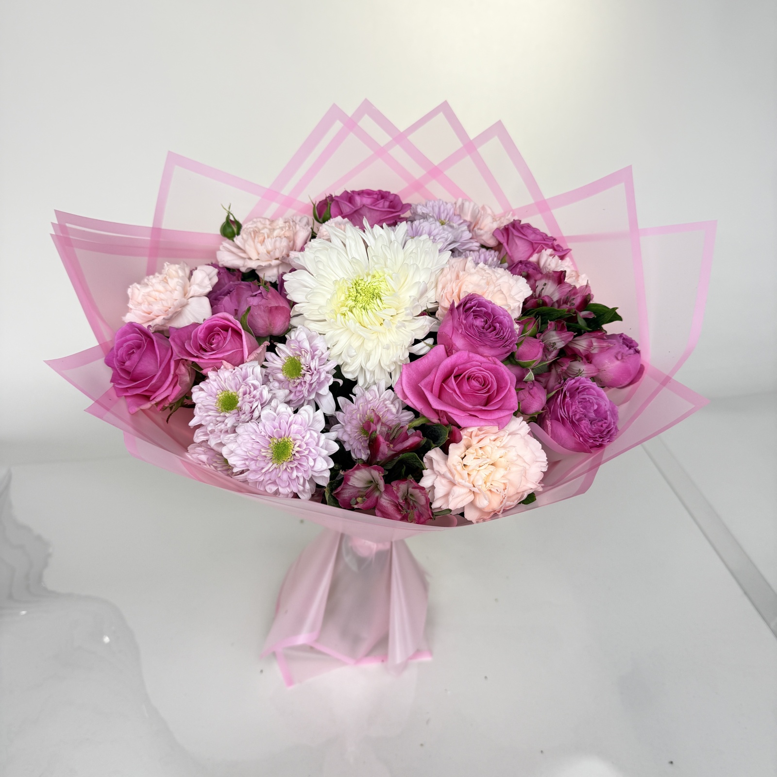 Состав: роза 4, альстромерия 2, роза кустовая 2, хризантема кустовая 2, хризантема 1 и прочее. под заказ