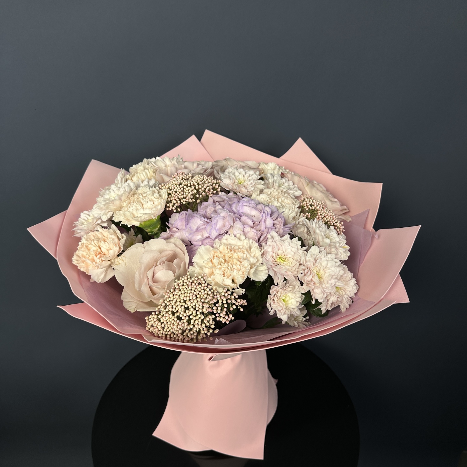 Состав: гвоздика 7, хризантема кустовая 6, роза кустовая 3, фисташка 0,5 и прочее. под заказ
