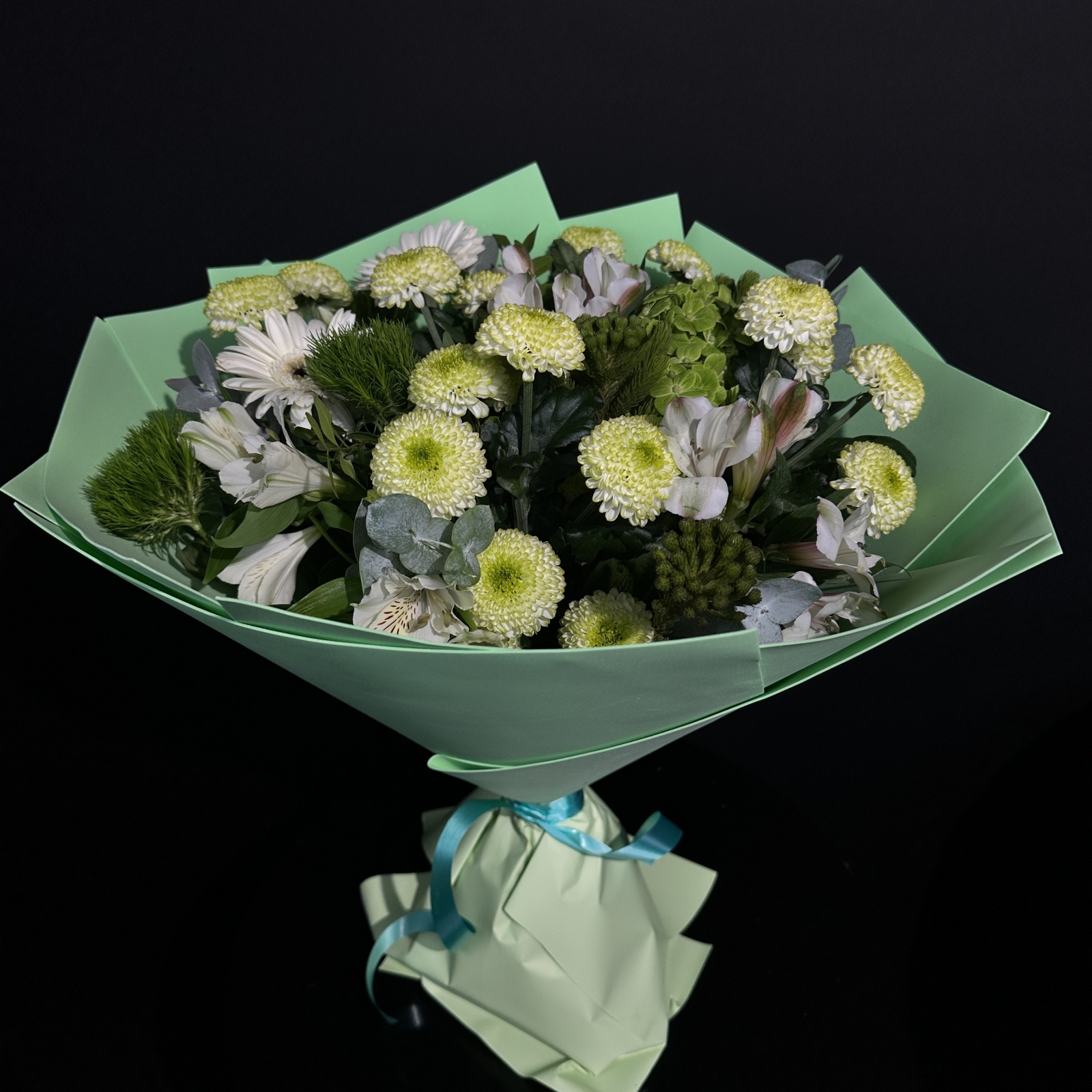 Состав: хризантема кустовая 4, альстромерия 3, гвоздика 3, бруния 3, гербера 2, гортензия 1, лилия 1 и прочее. под заказ